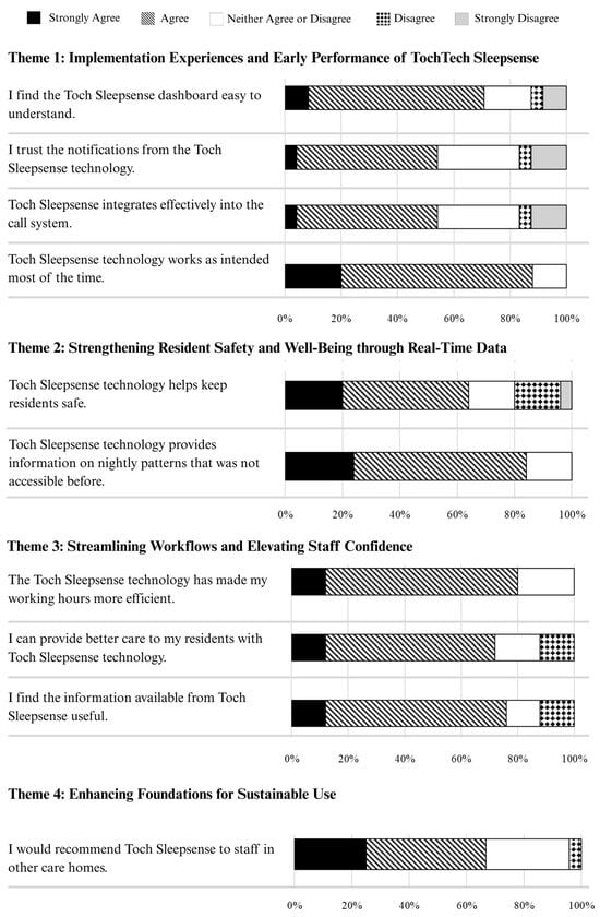 Staff perspectives on Toch Sleepsense were captured through both surveys and focus groups, with strong alignment emerging between quantitative responses and qualitative insights. As shown in Figure 3, most staff reported favorable experiences across areas such as usability, care quality, and workflow efficiency. These survey responses reflected and reinforced the qualitative findings, demonstrating convergence across data sources and highlighting key patterns in how the technology was perceived and integrated in day-to-day care.