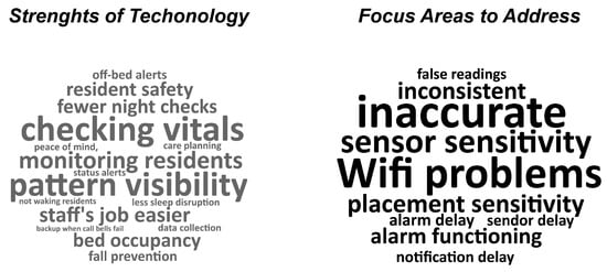 Figure 4 shows word-cloud visualizations of staff feedback on the implementation of Toch Sleepsense. This word-cloud provides a visual depiction of common themes and ideas expressed by staff members when discussing Sleepsense. The size of the word in the figure represents the number of times this was mentioned by the participants. Participants consistently identified fall prevention (shown in large font under strengths of technology), followed by vital-sign monitoring, and the ability of the sensors to make their job easier as key strengths, as well as highlighting how real-time insights reduced intrusions into residents’ rest. At the same time, many expressed ongoing concerns about inconsistency (Shown in large font under focus areas to address), internet issues, and delayed alerts, which can hamper the technology’s potential if connectivity and training gaps remain unresolved. When the sensor functioned reliably and staff understood its features, they felt more assured, describing a setting where tasks were better prioritized, time-consuming hourly checks were reduced, and resident well-being remained paramount.