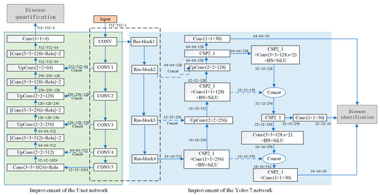 The workflow begins with YOLOv7, which serves as the detection backbone. It receives the original and labeled images and generates bounding boxes for each identified disease. The YOLOv7 architecture consists of convolutional layers, residual connections, and multi-scale feature fusion, enabling the model to effectively capture both large and small disease features. After detection, the candidate regions generated by YOLOv7 are passed to the improved U-Net network for pixel-level segmentation. Detailed descriptions of the two improved networks are provided later in the text.