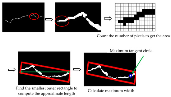 Upon obtaining the binary image, numerous diseases within the original image can be effectively distinguished from the background area, presenting them as white region on a black background. Then, the disease parameters can be precisely identified and detected. Specifically, a minimum bounding rectangle is fitted to each segmented disease region. This step facilitates the measurement of key geometric attributes, including area, length, width, and other pertinent values. The specific detection steps are presented in Figure 4.