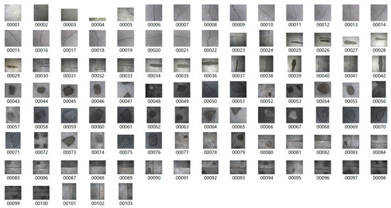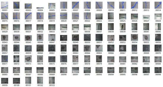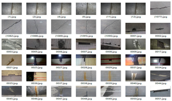 Following fabricating concrete slaps with simulated diseases, images were captured using a CMOS industrial camera made by HIK VISION in Hangzhou of China. The key parameters of the camera are as follows: lens focal length is 16 mm; sensor size is 2/3 inch; pixel size is 3.45 μm × 3.45 μm; total number of pixels is 2448 × 2048; the maximum frame rate is 24 frames per second. These images maintain an elevated level of accuracy, with each pixel representing 0.1 mm. As shown in Figure 10, the images captured by the CMOS include 25 of cracks, 22 of water leakage, 37 of spalling, and 28 of seam diseases. Some images contain multiple co-occurring diseases, enhancing the comprehensiveness for analysis. Examples of these photographed images are presented in Figure 11.