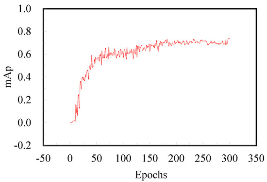 Mean average precision (mAP) is the average of the AP values across all detected categories. mAP is determined using Equation (7). Upon acquiring an ROI in a detected image, the target detection network usually applies the IoU threshold to the ROI against the ground truth bounding box. This step determines whether the ROI is classified as a positive or negative sample. The IoU threshold is a key hyper-parameter, typically set to 0.5, which remarkably affects the model’s detection accuracy. A lower threshold value means a higher model detection accuracy, whereas a higher threshold value implies a lower accuracy.