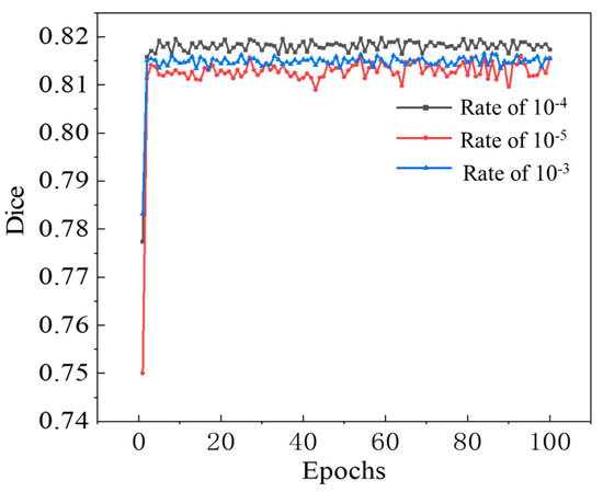 The model achieved its optimal performance at the learning rate of 10−4. At this specific setting, the Dice coefficient reaches 0.82, revealing a high degree of similarity between the identification results and the ground truth. Consequently, this setting produces excellent identification results, demonstrating its effectiveness in accurately identifying target structures.