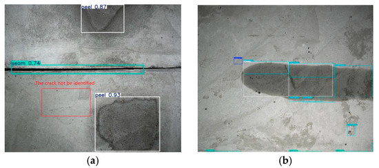 Cases of missed identification and misidentification. (a) Crack is not identified; (b) identified peel and leakage are not true peel and leakage.