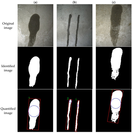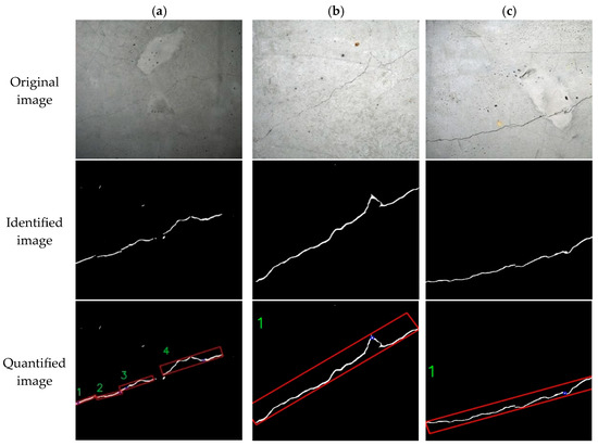 Figure 14 shows three typical crack images processed by the UNet-based segmentation network to produce segmentation maps. Then, a quantitative analysis model measures the geometric parameters of the identified cracks. In Figure 14a, four crack regions are sequentially labeled and measured. The oriented minimum bounding rectangle surrounding each crack is highlighted by a red rectangle, and the maximum inscribed circle is denoted by a blue circle. These four labeled regions in fact form a single continuous crack. Hence, the maximum width of the entire crack can be determined by integrating the using the methodology for identifying multiple cracks through labeling with maximum inscribed circle algorithm. Subsequently, Figure 14b,c are identified as depicting a single continuous crack. The results of the quantitative identification of specific crack information are presented in Table 6 and Table 7.