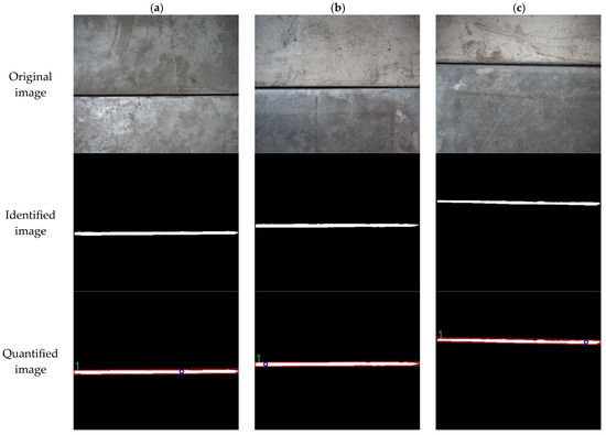 Figure 15 shows three typical seam images, processed using the same workflow as for the crack tests. The measured seam widths are 2.60 mm, 2.50 mm, and 2.50 mm, for Figure 15a–c, respectively. The seam widths are wider than the cracks. According to relevant tunnel specifications, 4 mm serves as a critical value for seam width. The results of quantitative identification for specific seam information are summarized in Table 8.