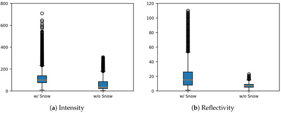 A comparison of intensity and reflectivity between snow-covered and snow-free surfaces in the point cloud map revealed distinct differences, with snow-covered regions showing higher mean values—approximately 53.6 for intensity and 11.9 for reflectivity. As illustrated in Figure 2, snow-covered areas generally occupied higher ranges across both indicators, with elevated medians and upper quartiles. Outliers were more prevalent in snow-covered regions, indicating irregular strong reflections, whereas snow-free ground exhibited narrower interquartile ranges and fewer outliers, reflecting more stable surface properties. These distinctions demonstrate that both intensity and reflectivity are effective physical cues for snow detection. Accordingly, this study proposes a detection method that leverages the dense representation of accumulated point clouds to capture such surface patterns.