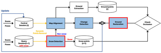 This study proposes a system architecture for map updating in snow-covered environments. Figure 3 illustrates the overall flow of the proposed architecture. The architecture consists of four core modules: Snow Removal, Map Alignment, Change Detection, and Ground Restoration. The system first detects and removes snow from LiDAR point cloud data. It then performs inter-session registration to align multiple sessions. After alignment, environmental changes are identified by comparing the sessions. Finally, the system restores ground surfaces occluded by snow.