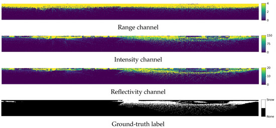 Figure 7 illustrates examples of the input images and snow region labels used for training. Based on keyframes containing snow, map-projected images with a resolution of were used as training inputs. Each image consists of six channels representing spatial coordinates , range , reflectivity , and intensity . Regions with high intensity and reflectivity show distributions similar to the annotated snow regions. This indicates that these features provide useful cues for snow detection.