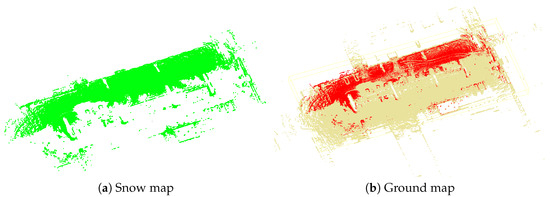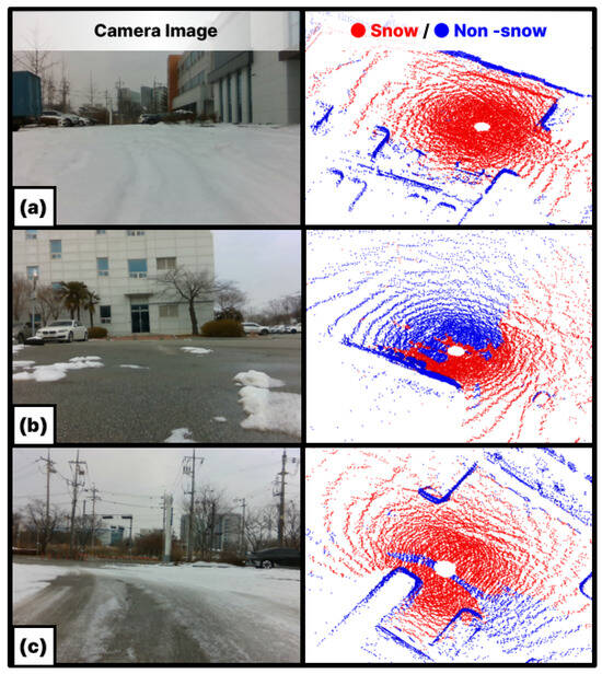 Figure 10 shows the snow segmentation results obtained using intensity and reflectivity as input features. The model achieved an IoU of 78.6%. Stable performance was observed when the boundary between snow and ground was clearly distinguishable. However, in cases where the boundary was ambiguous, as illustrated in Figure 10c, misclassification occurred and the IoU for the snow class was reduced to 62%. Figure 11 presents the map after snow removal based on the detection results. This map was subsequently used as input for the map alignment process.