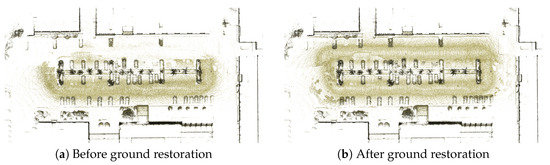 As shown in Figure 13b, applying the proposed algorithm restores most of the occluded ground in the vacant region. Quantitatively, 95.30% of the ground regions that required restoration due to snow occlusion were successfully recovered using the Central session’s ground map. This result demonstrates that the proposed algorithm plays a crucial role in reliably preserving ground information.