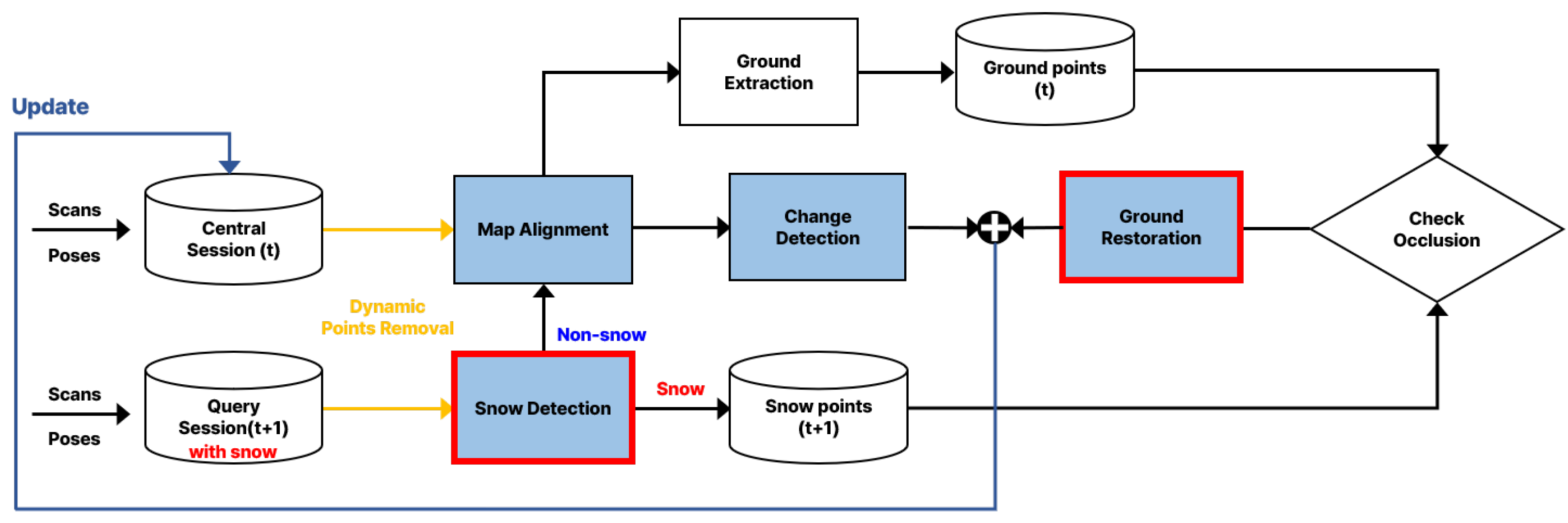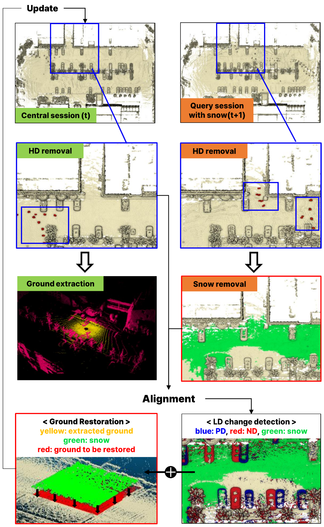 - We restore ground regions occluded by snow using information from the previous session, thereby preserving the overall consistency of the map.