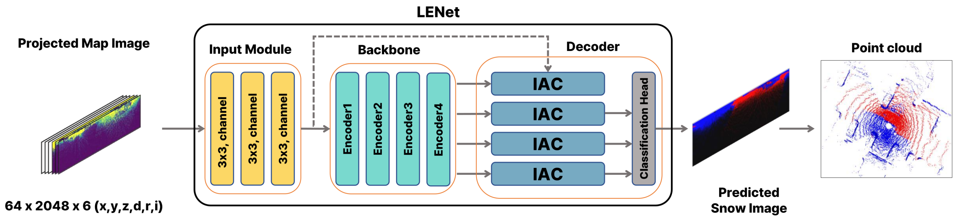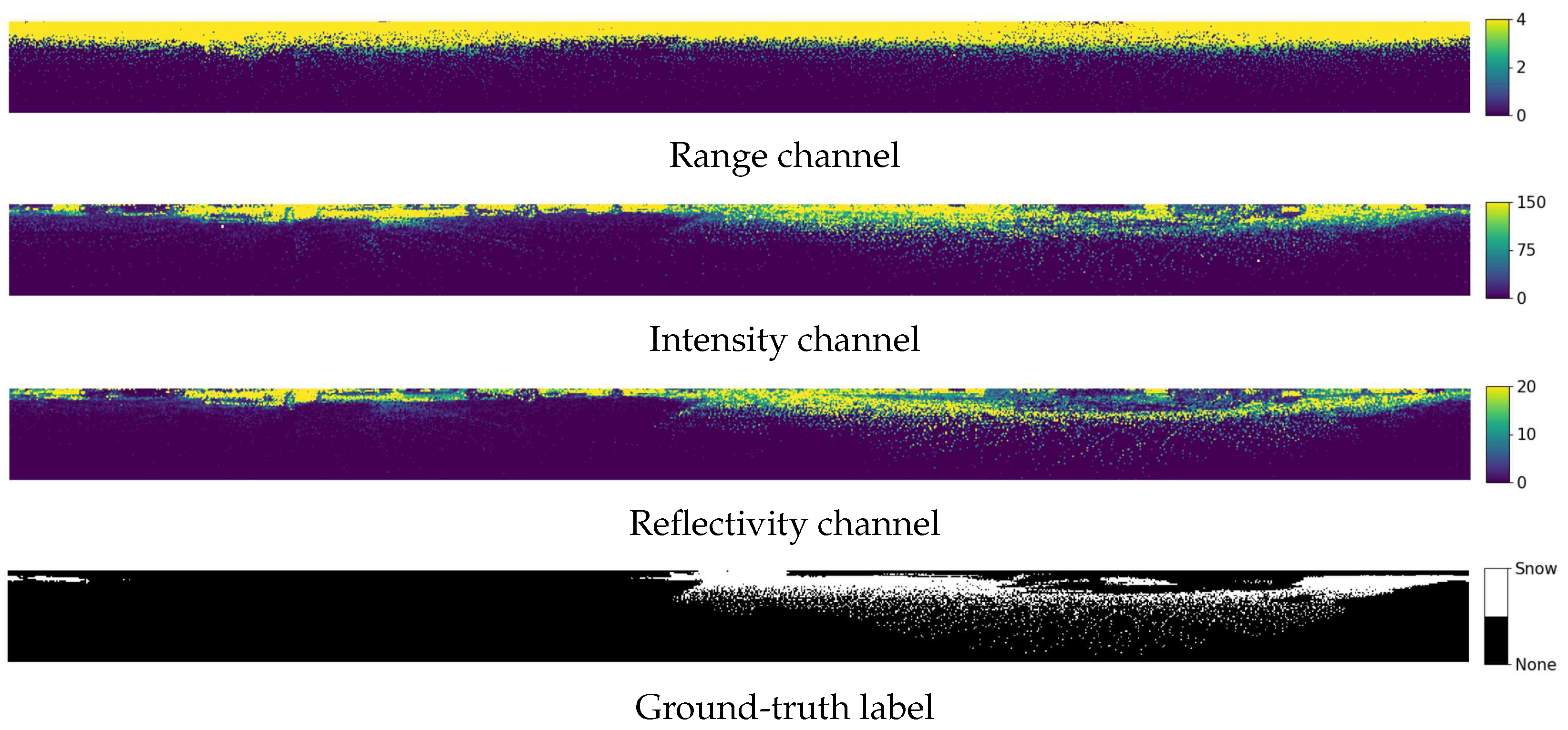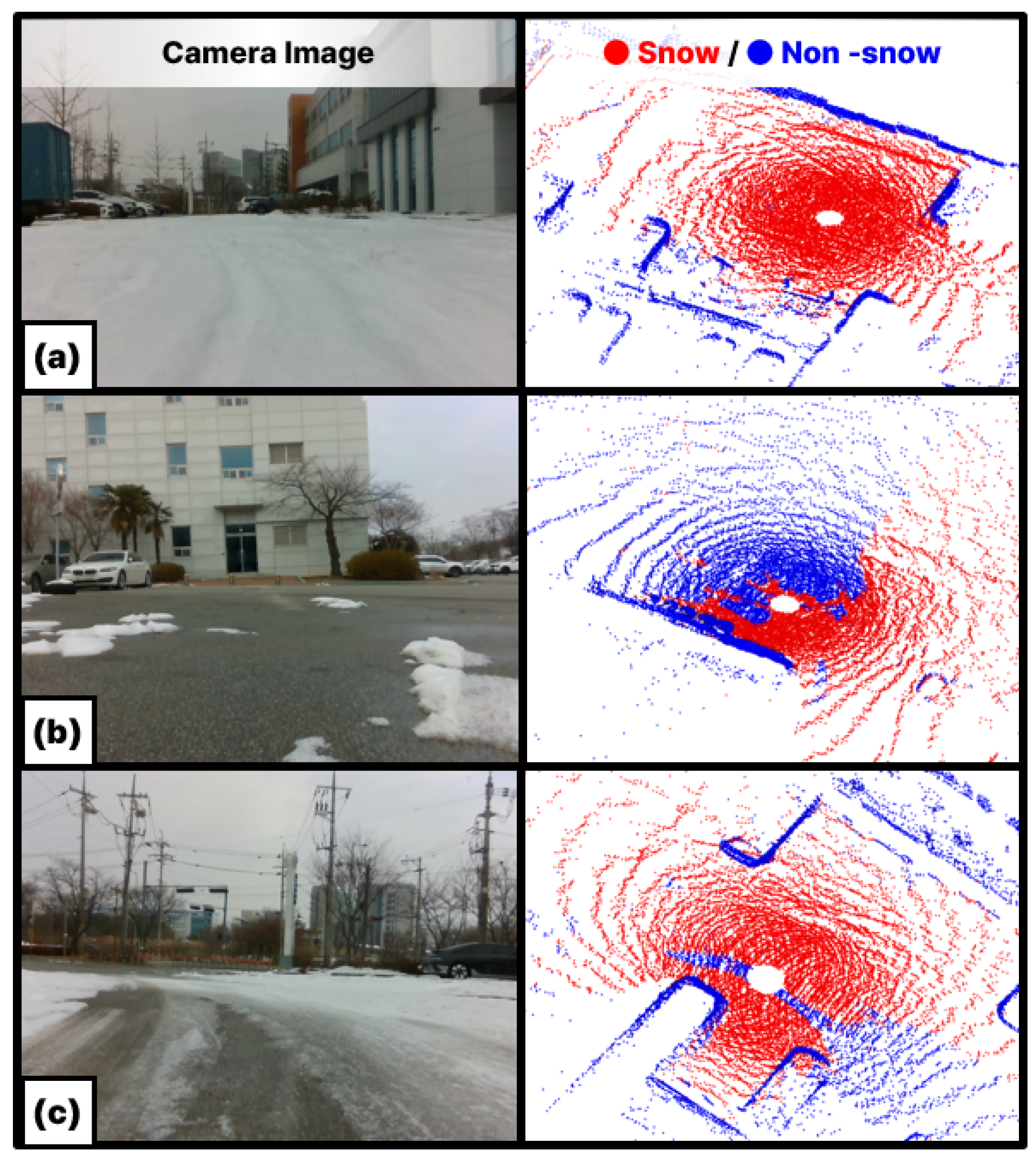 - We develop a deep learning-based segmentation method that effectively detects snow by utilizing LiDAR reflectivity features and resolving input sparsity limitations.