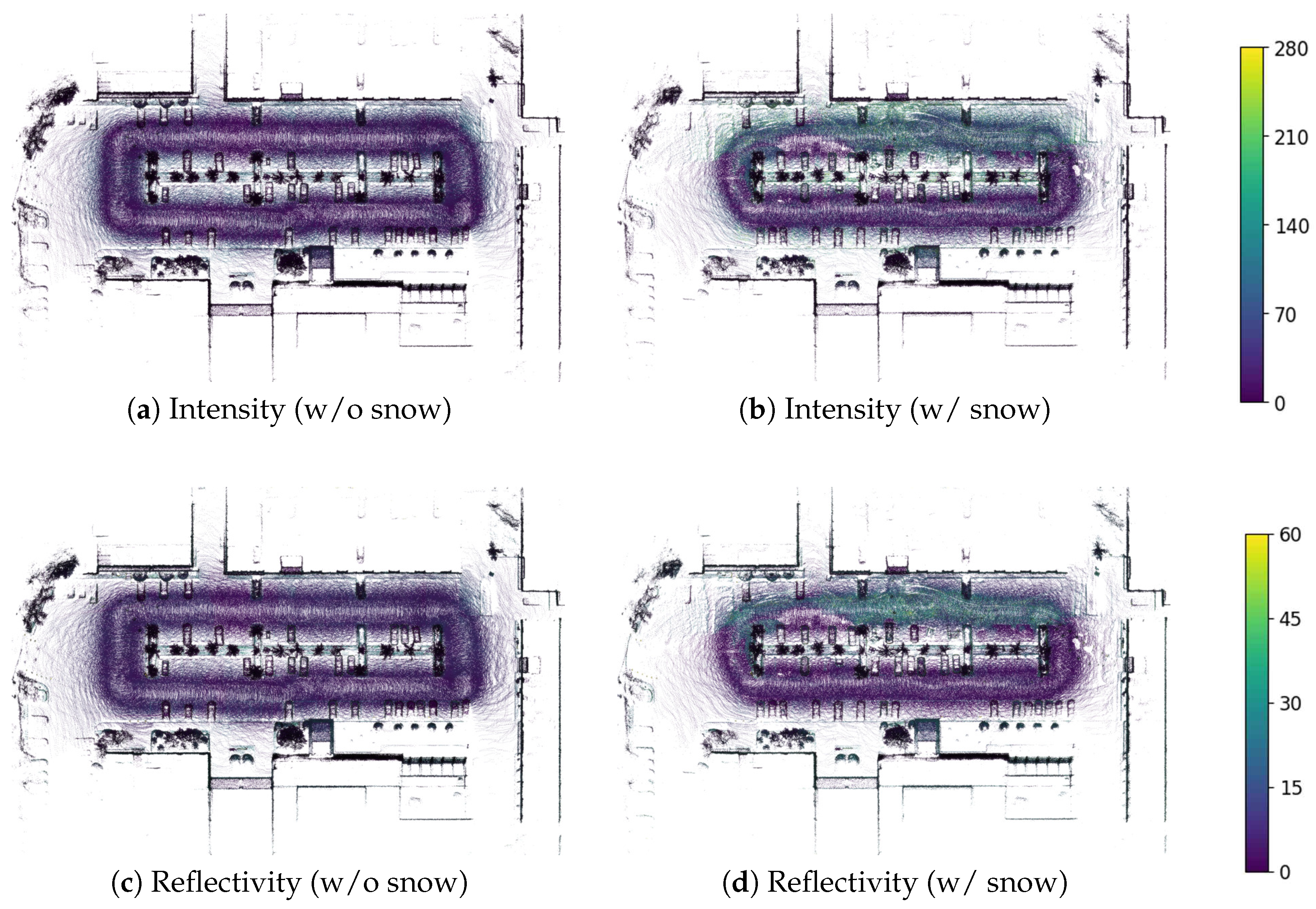 - Yu, M.; Vasudevan, R.; Johnson-Roberson, M. LiSnowNet: Real-time snow removal for LiDAR point clouds. In Proceedings of the 2022 IEEE/RSJ International Conference on Intelligent Robots and Systems (IROS), Kyoto, Japan, 23–27 October 2022; pp. 6820–6826. [Google Scholar] [CrossRef]