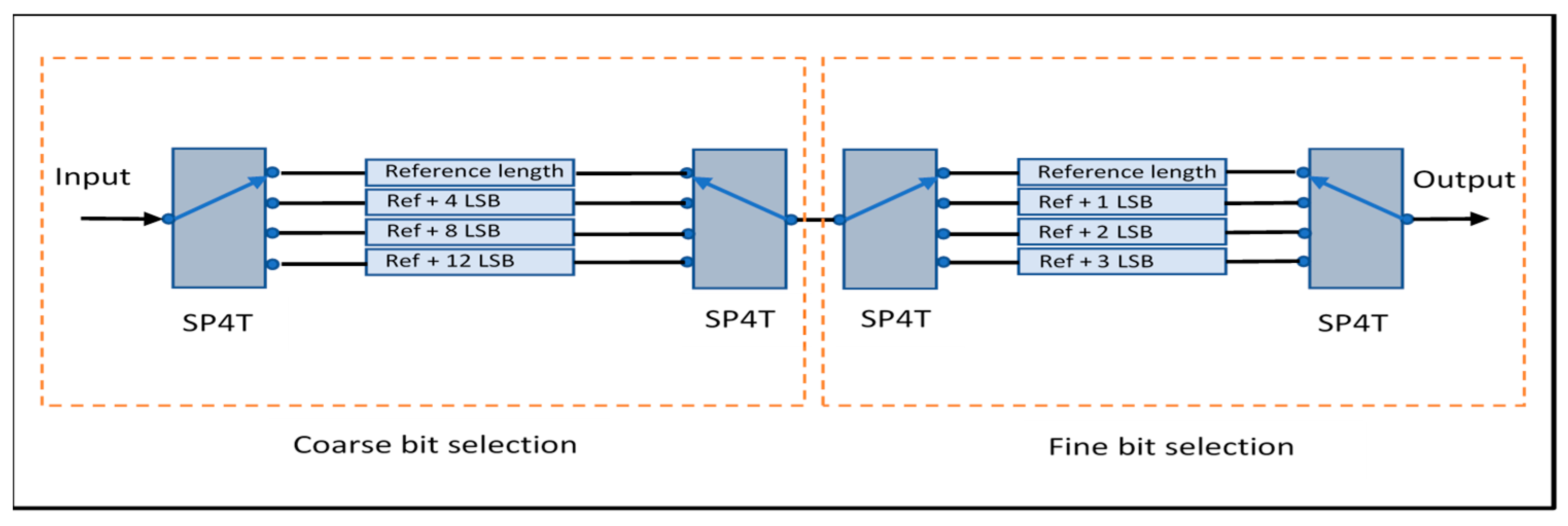Figure 1 illustrates the topology. A switched-line delay unit creates discrete time delays by selecting between transmission lines of varying lengths using RF switches. Each line introduces a fixed delay increment relative to a reference “zero” delay, achieving a maximum delay of 412.5 ps, with LSB = 27.5 ps.