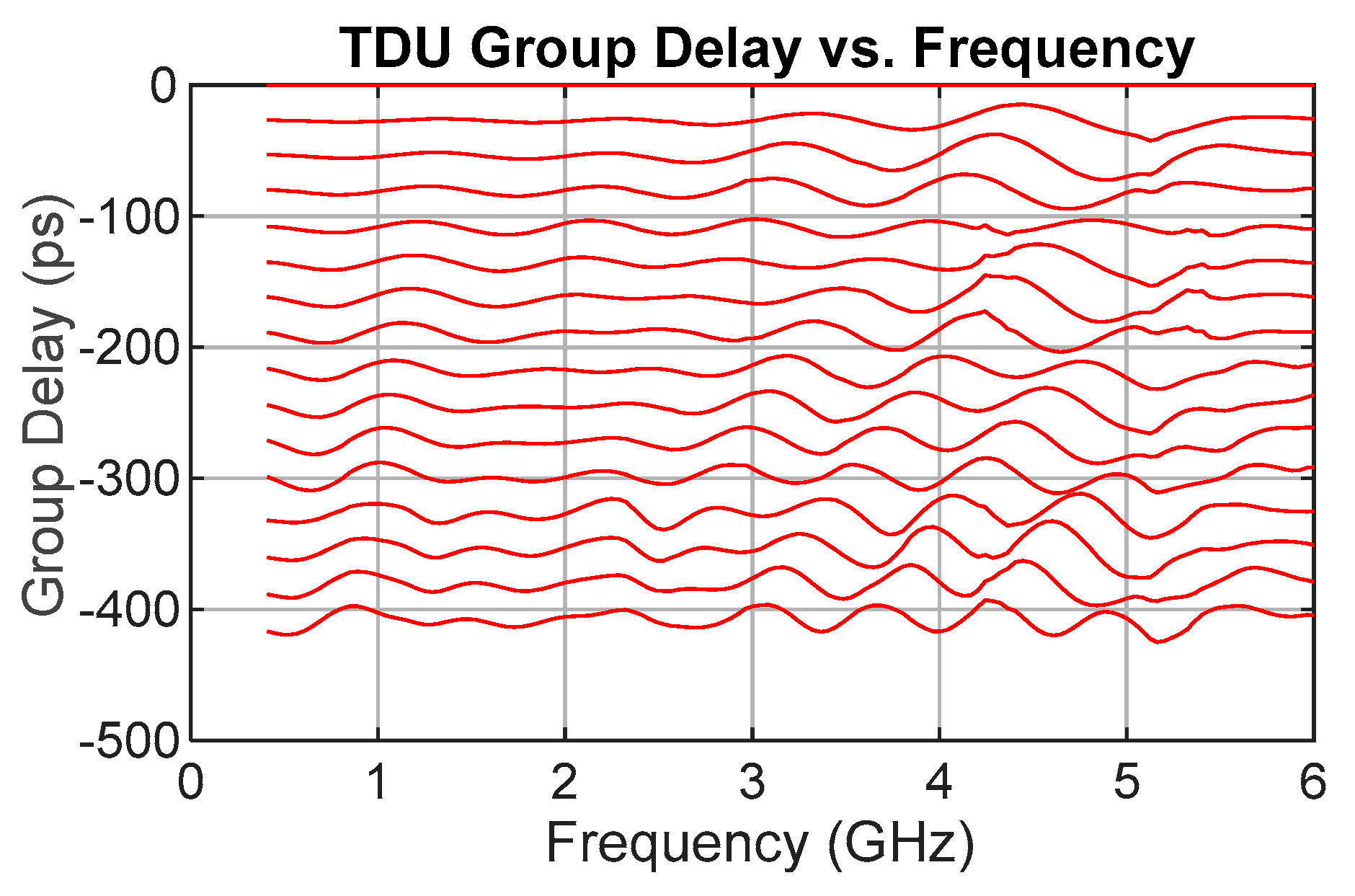 While S21 phase confirmed correct operation, group delay, calculated as the negative derivative of phase with respect to frequency, was the primary figure of merit for TDU performance.