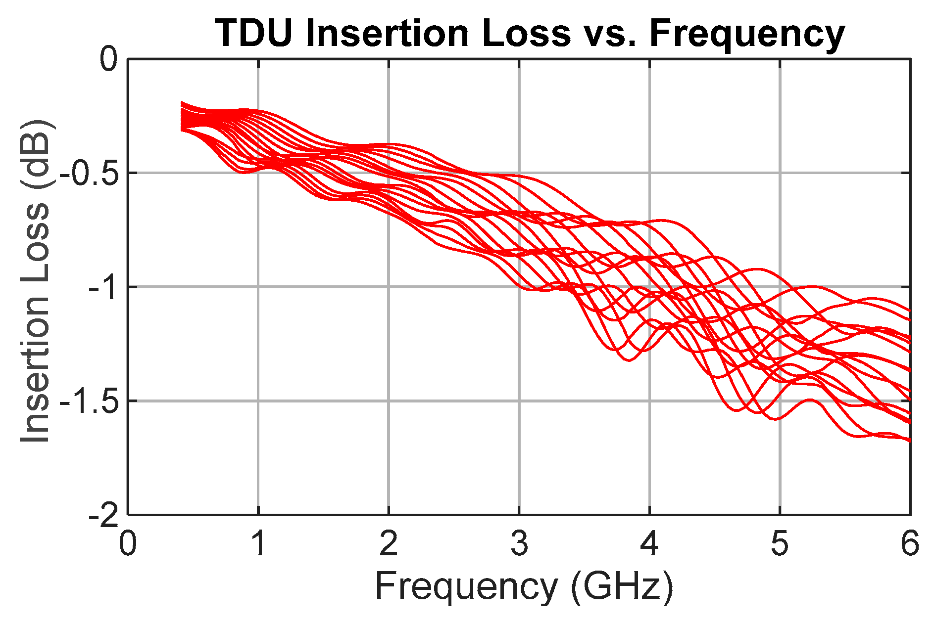 Subsequent MATLAB (R2023a) analysis with the perfect-switch model confirms that the group-delay ripple increases by roughly 15 ps RMS when the delay-line impedance is varied from 50 Ω to 60 Ω, corresponding to a sensitivity of approximately 1.5 ps RMS per ohm of impedance deviation.