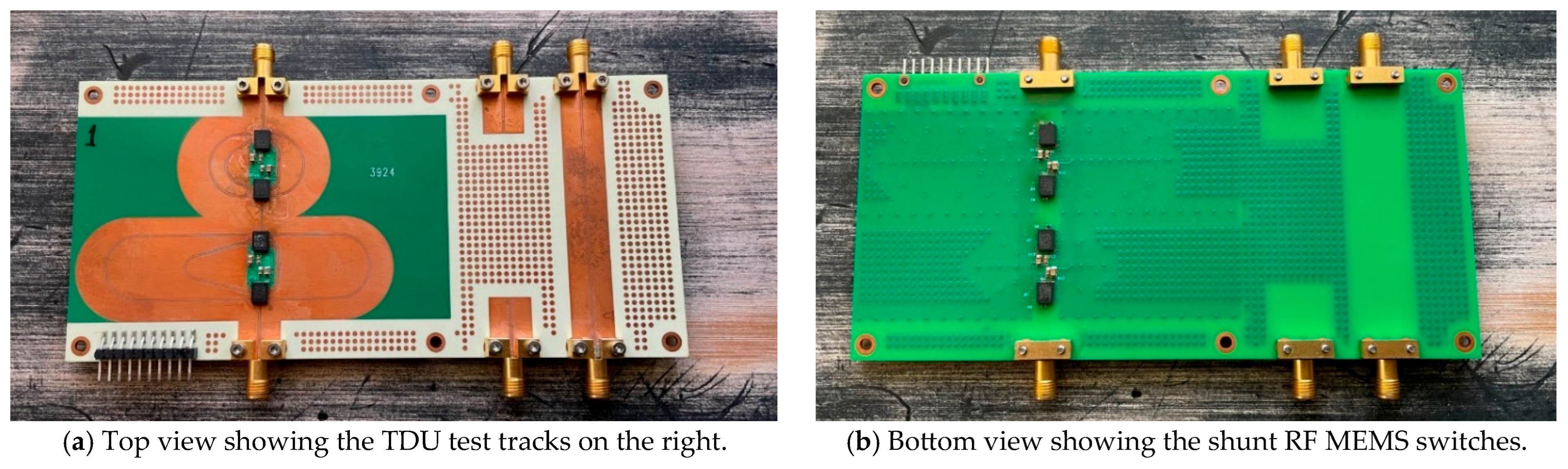 The novelty of this work lies in its use of commercially available RF MEMS switches in a compact, manufacturable PCB implementation. Unlike prior designs that required custom dies, high-voltage switch actuation, or exotic substrates, this TDU leverages LGA-packaged RF MEMS switches and coplanar PCB technology to achieve high performance with low complexity.
