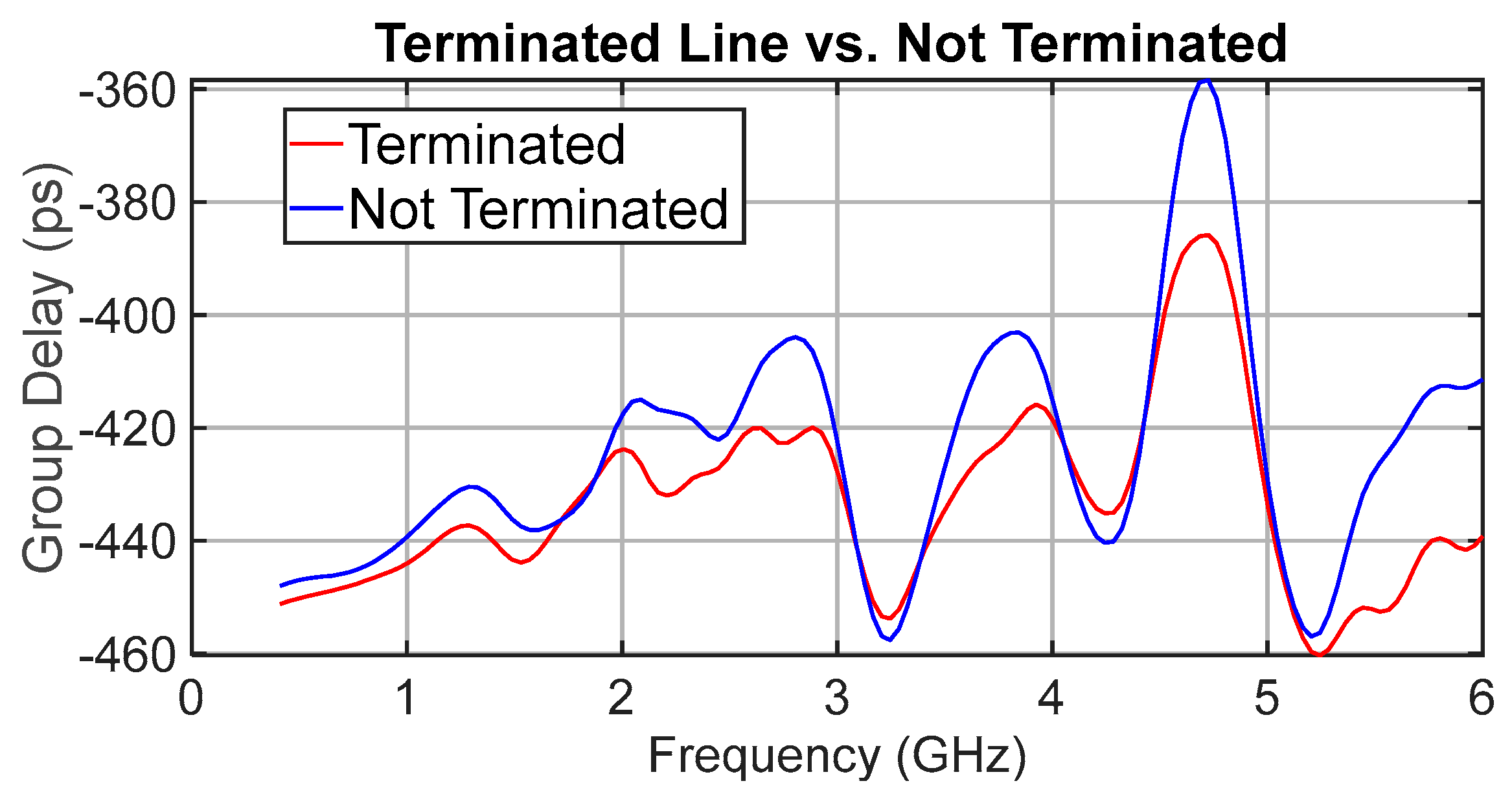 Figure 12 shows a comparison of the group delay for delay state 15 (the longest delay path). There is a measurable benefit from terminating the unused tracks: the peak delay variation improves by approximately 25 ps at 4.7 GHz (nearly one LSB). However, the residual ripple with terminations remains 74 ps peak to peak, so the overall benefit is moderate. As shown later in
