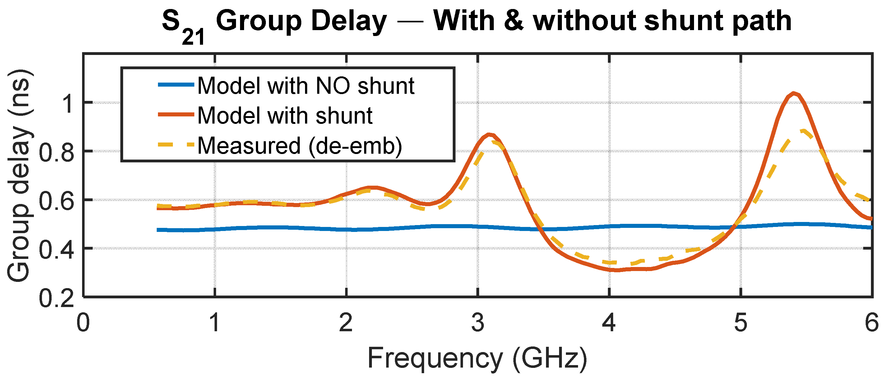 Figure 14 illustrates the corrected multiport model for the absolute delay state 0 over 0.4–6 GHz. The curve with the OFF-path shunt network (parallel switch plus termination) closely reproduces the measured group delay, while a hypothetical variant without the shunt shows the substantial ripple reduction achievable when the shorting network is eliminated. This isolates the OFF-path shunt as the dominant contributor to the observed ripple; layout-related reflections set only a smaller baseline.