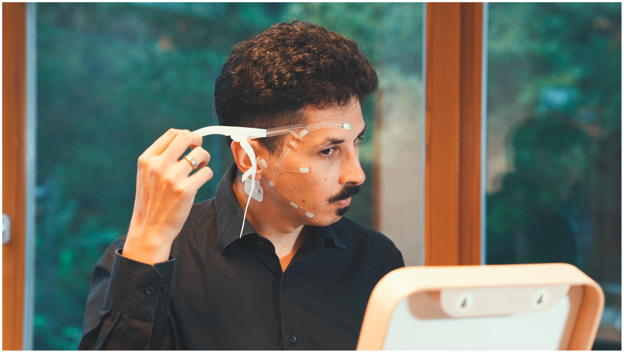 Figure 2. A mirrored design allows for parallel recordings to be made on the same individual using both conductive materials. The design includes eight recording electrodes and two more electrodes serving as reference and ground. Three electrodes (reference, ground, and one recording electrode) are positioned behind the ear, while the remaining electrodes are placed in the facial area. Electrodes 1, 2, and 3 enable, in addition to EEG recordings, the derivation of horizontal, vertical, and diagonal electrooculogram (EOG) signals, similar to EOG recordings in sleep laboratories (cf. [