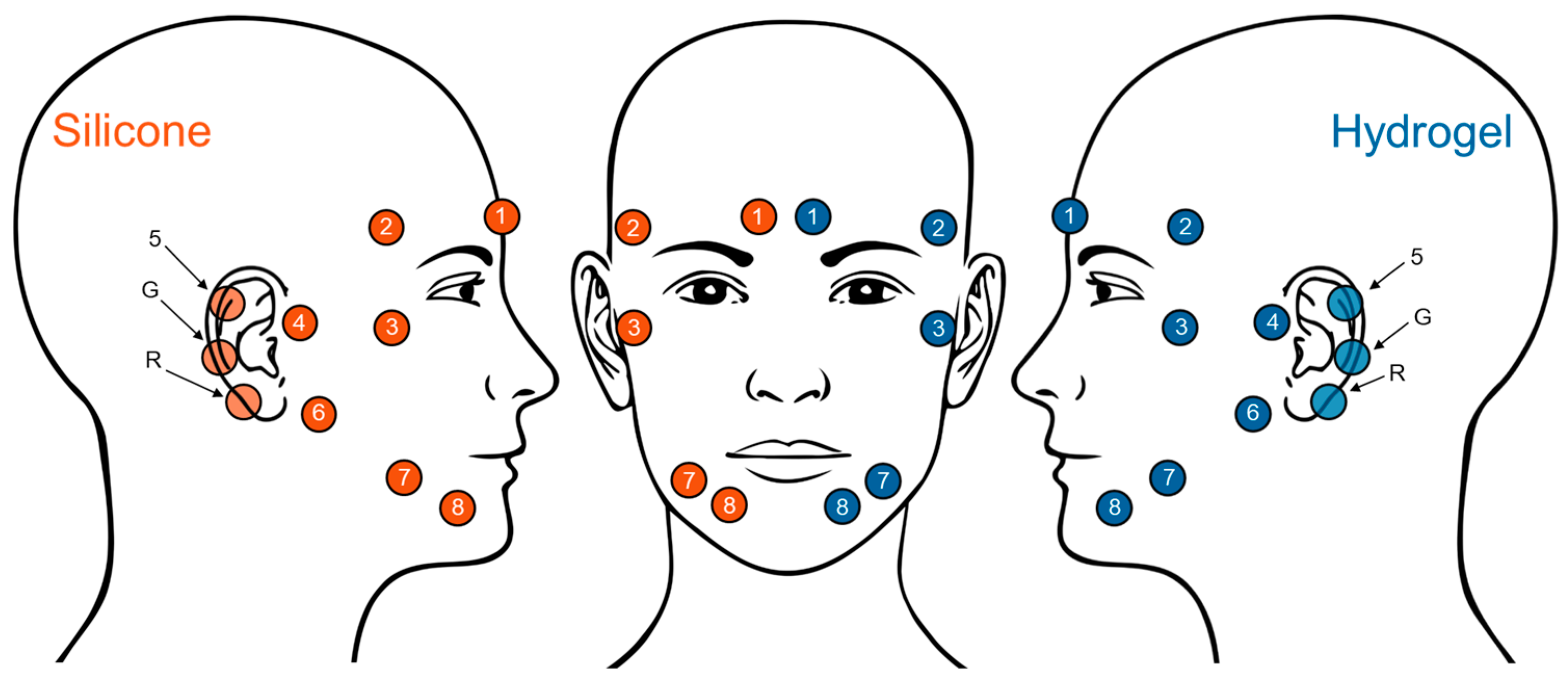 13]). Electrodes 7 and 8 aim to capture facial electromyogram (EMG) signals, comparable to EMG recordings in sleep laboratories. EOG- and EMG-specific derivations will not be discussed further in this paper, as the focus is on EEG data. Two conductive materials were applied to the electrode areas of the flexible grid: a curing conductive solid gel (hydrogel) on the left side of the face, and a novel silicone-based dry material on the right side, as illustrated in