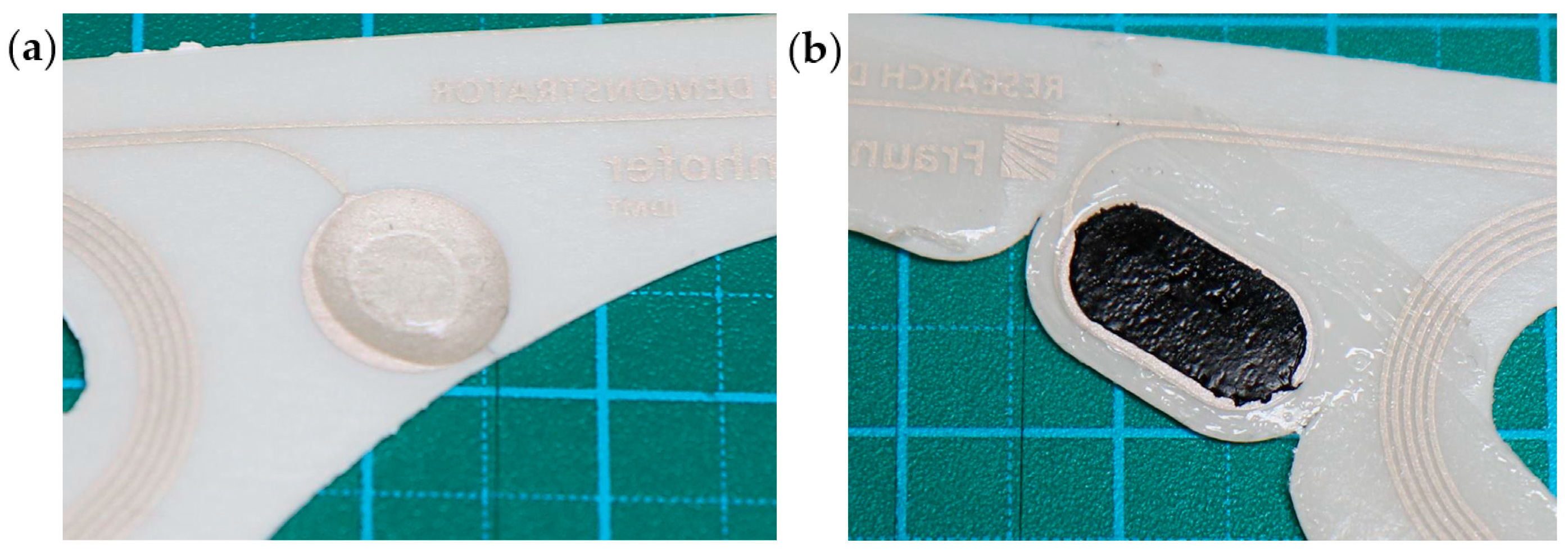Hydrogel made from water, a polymer, and sodium chloride is commonly employed for electrocardiogram recordings (MTG Imiella Medizintechnik, Lugau, Germany). It was manually applied to the electrode surface in liquid form and subsequently cured under UV light to achieve an elastic yet stable and solid droplet shape. The electrode surface was designed as a circle to accommodate the droplet shape of the conductive material. Electrodes with this material were stored in sealed bags prior to use to prevent the hydrogel from drying out. The second material is a novel silicone-based conductive material (DuPont™ Liveo™ Soft Skin Conductive Tape, DuPont, Braine-l’Alleud, Belgium). These electrodes were designed with an oval shape to allow the patch to remain as narrow and delicate as possible. In both cases, the effective electrode surface corresponds to a circle with a 9 mm diameter. Both materials are shown in