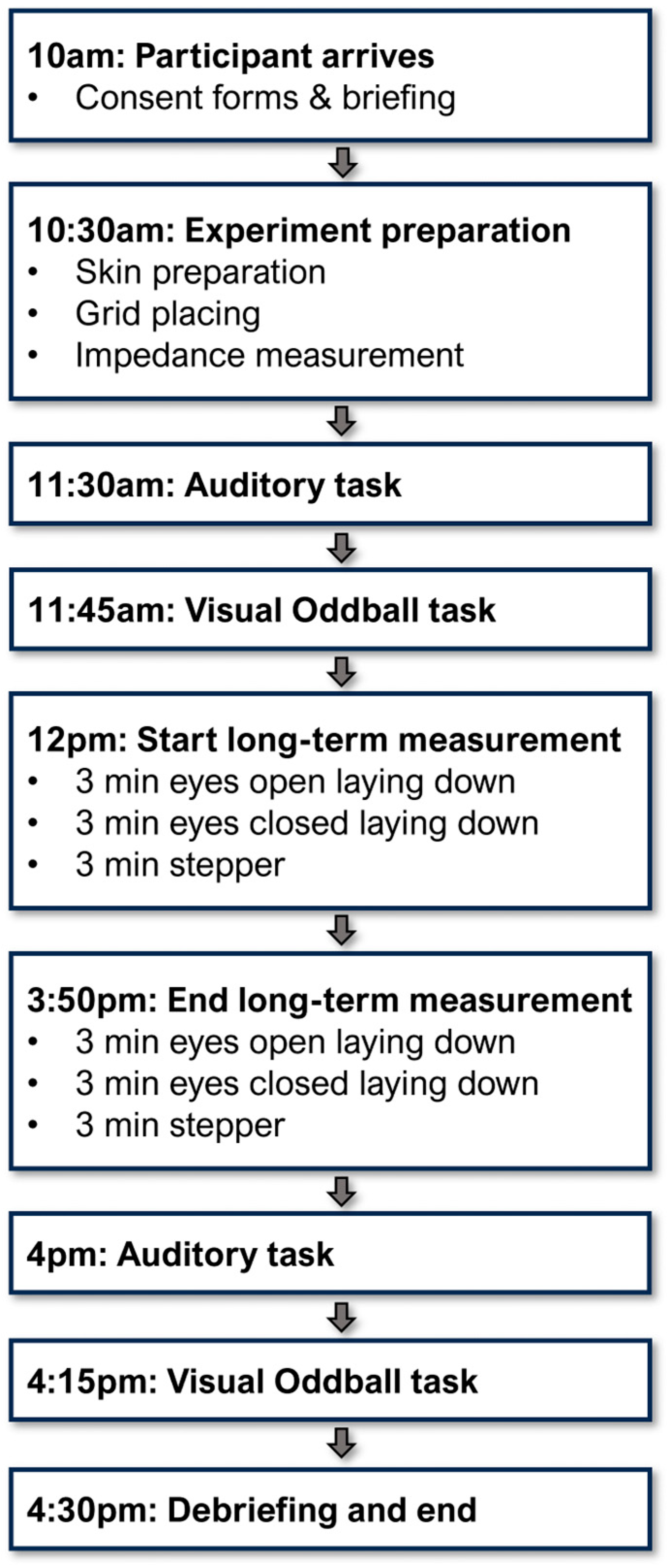 Figure 4). Each participant took part in two auditory tasks and two visual oddball tasks (one of each in the morning and one in the afternoon), as well as a long-term task containing movement and rest conditions. The current study presents data from the two auditory tasks (AEP response) as well as impedance data for all tasks concatonated together from the morning until the afternoon, including the long-term measurement. Task-specific data from other tasks, including the visual oddball task, and eyes-open and -closed resting tasks, may be presented in subsequent publications.