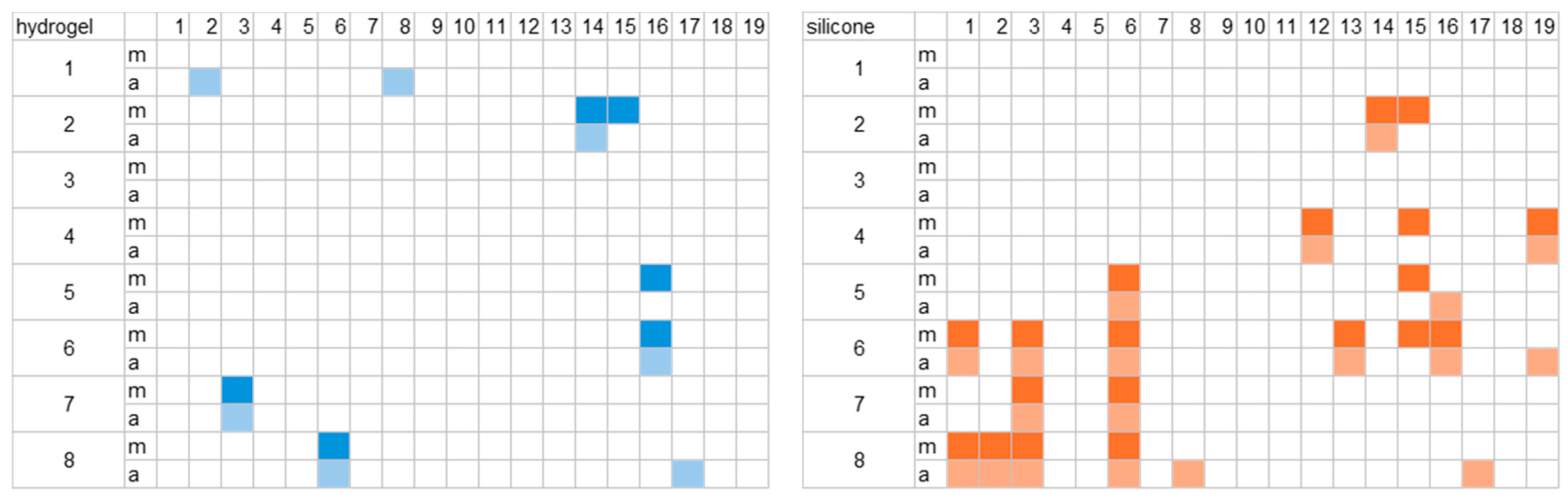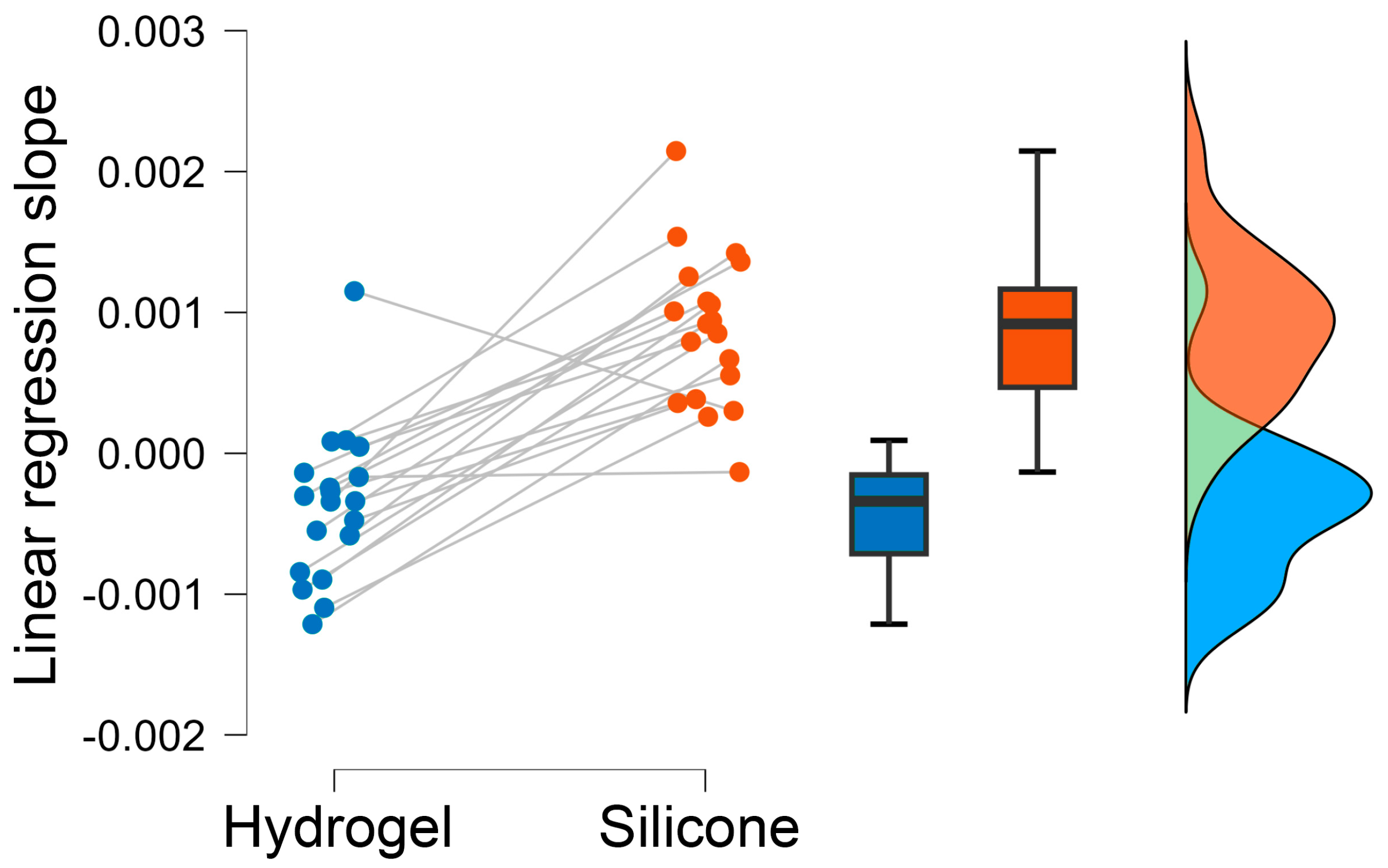 Figure 8). The hydrogel regression lines revealed predominantly negative slopes, while the silicone regression analysis showed predominantly positive slopes. The median slope and its standard deviation for the hydrogel are −3.7 ± 5.4 × 10