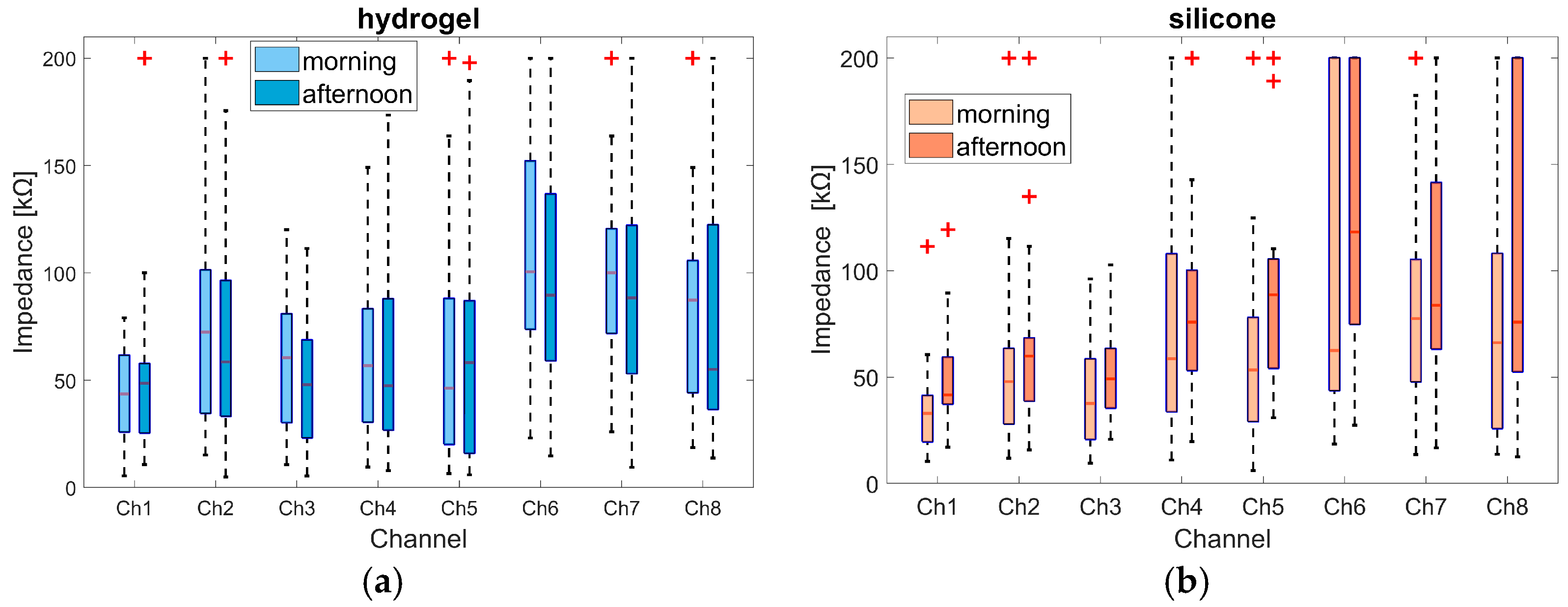 For the hydrogel material, the median value for all channels except 1 and 5 was smaller in the afternoon than in the morning. The median values of channels 1 to 5 were all below 73 kΩ. Except for channel 2 in the morning (72.5 kΩ), the values of these channels were all below 61 kΩ. Channels 6 to 8 showed larger impedance values of up to 100.5 kΩ, such as channel 6 in the morning. The median value for channel 8 dropped from 87.3 kΩ in the morning to 55.1 kΩ in the afternoon.