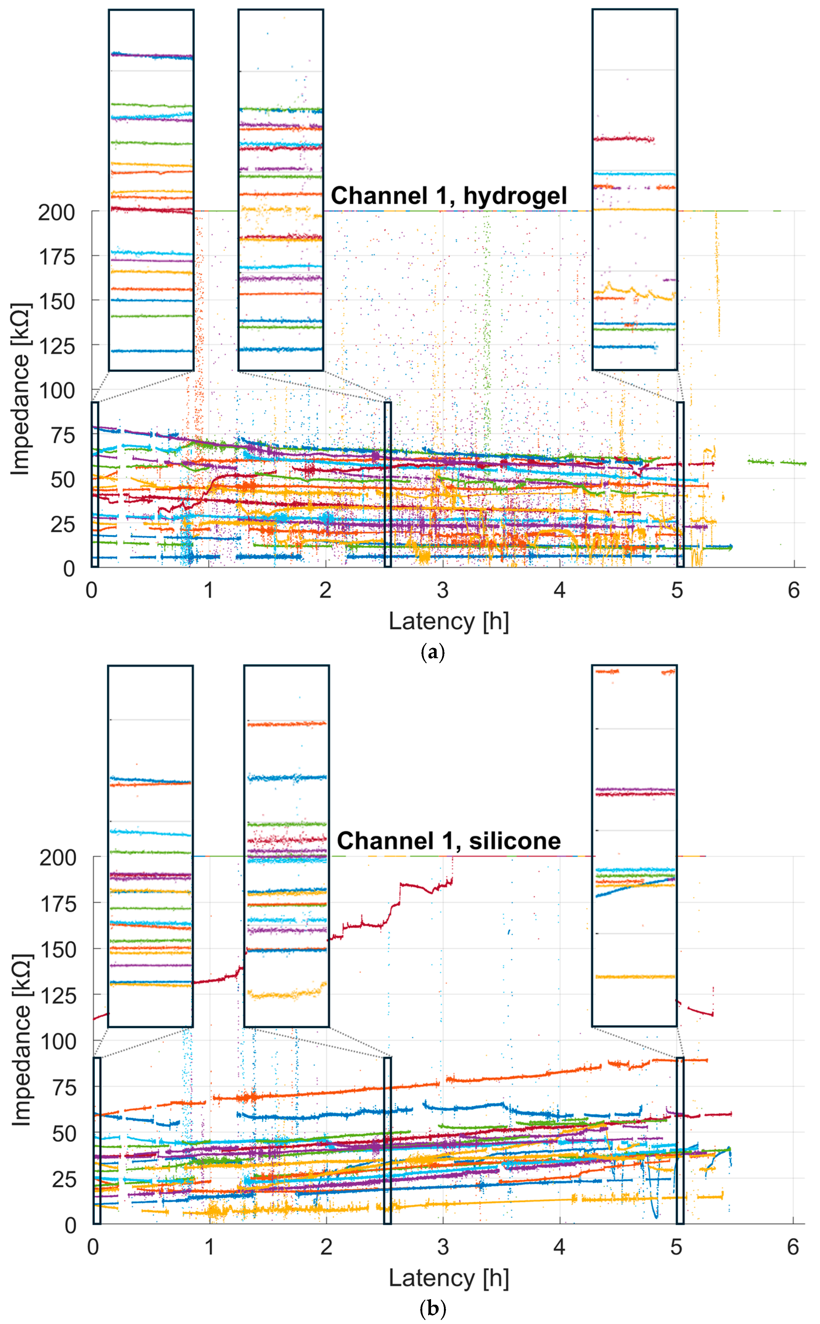 33]; however, we did not observe significant swelling in this study. This is likely because the study was carried out in a dry environment in the wintertime, when cooler temperatures do not cause excessive sweating, etc. Therefore, we did not measure whether this hydrogel swelling might have impacted the impedance levels.