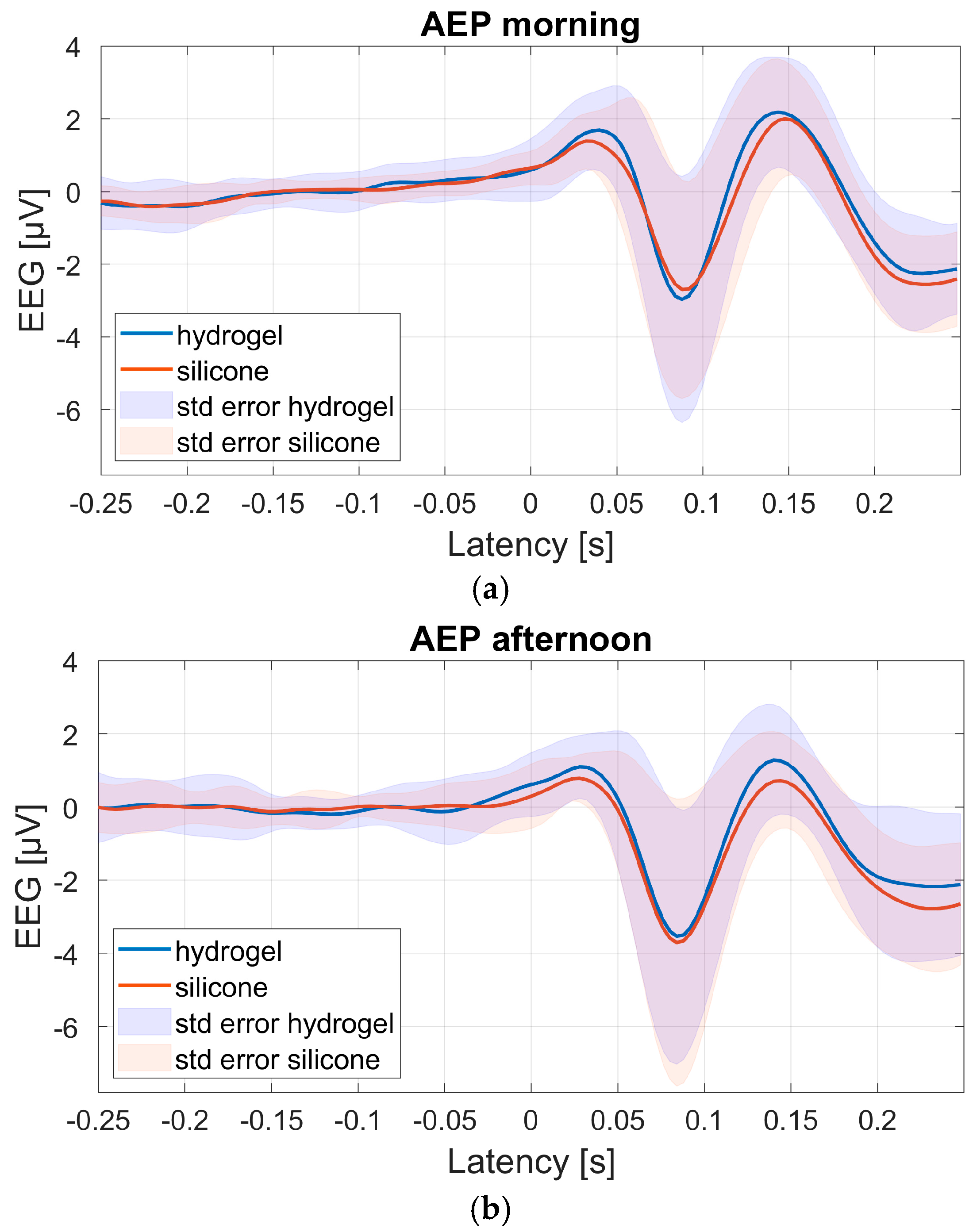 Figure 2) and were therefore susceptible to movement caused by speaking and chewing. Channel 1, which was located on the forehead, showed consistently less variance compared to other channels, and was therefore selected for further comparison. Furthermore, channel 1 showed a clear AEP response, which further supports the selection of channel 1 for the analyses. Regarding the AEP evaluation, it is noteworthy that the silicone material displays a higher number of valid epochs (in 17 of 19 subjects in the morning session and in 16 of 19 subjects in the afternoon session) compared to the hydrogel material. However, it is important to note that the number of epochs selected for the calculation of the AEPs was adjusted so that an equal number of epochs for both materials were included in the computation (see