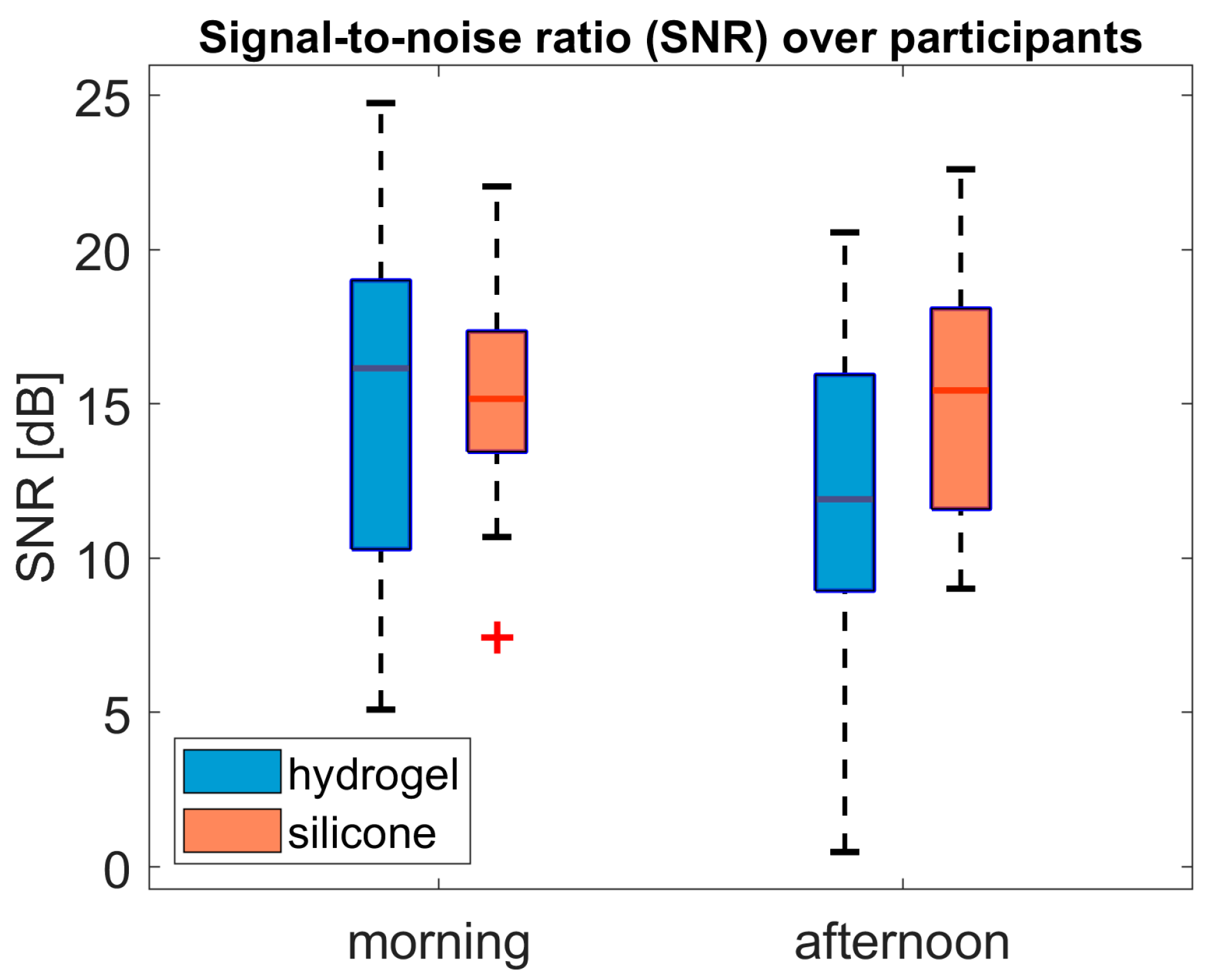 Figure 10 shows the dB SNR values of each participant, derived from the averaged AEPs recorded for each test material and auditory task. In the morning, hydrogel shows a wider range than silicone. Measurements taken in the afternoon showed a lower median value for hydrogel, indicating poorer SNR compared to silicone. The SNR range is wider for silicone in the afternoon than in the morning.