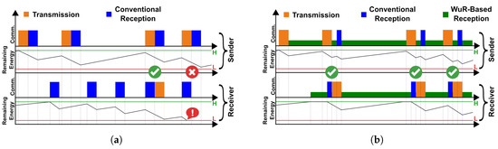 (a) Conventional communication using active radios requires synchronization between the sender and receiver. To achieve this goal, a receiver must consume considerable energy for idle listening. This behavior can introduce a prohibitively high energy overhead into a batteryless device, resulting in inefficient communication among such devices. (b) Wake-up Receivers (WuRs) enable efficient, low-power monitoring of the wireless channel. Thus, employing WuRs in the design of batteryless devices offers numerous advantages, such as low energy overhead, low communication latency, and high scalability.