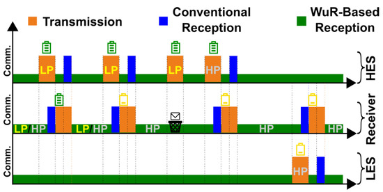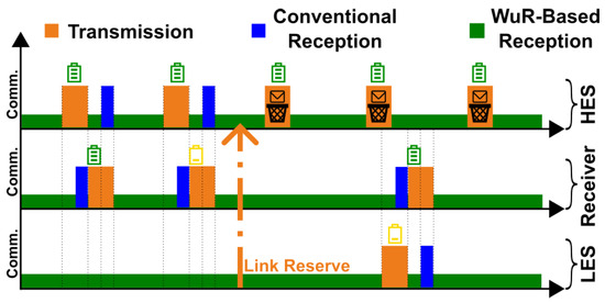 The link reservation mechanism relies on broadcast messages to notify nearby devices about the communication attempt of a low-energy sender (LES). As a result, a high-energy sender (HES) avoids addressing the designated receiver for a short period, resulting in the accumulation of energy on the receiver and, therefore, a higher chance of successful communication between the LES and the receiver.