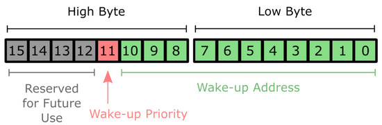 To implement this mechanism in practice, we define two priorities for waking up a device and exploit the addressing capabilities of the FH101RF WuR to enforce the different wake-up priorities. As Figure 3 shows, the FH101RF receiver has a 16-bit address space for waking up specific receivers. We reserve the upper 4 bits for future use and utilize bit 11 to carry out the prioritization. Setting the priority bit implies a high wake-up priority, while clearing it implies a low one. The rest of the bits are used for enumerating the different sensor nodes of a network, ultimately resulting in an 11-bit address space for the specific devices.