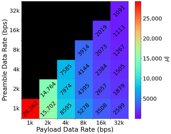 Considering the discussions above, we employ a Keithley 2450 SMU (Keithley Instruments, Inc., Cleveland, OH, USA) for conducting experiments to measure the energy required to send wake-up signals by a sensor node (the hardware implementation of the sensor node will be discussed in detail in Section 4). In this case, the wake-up signal consists of the preamble followed by a 16-bit wake-up address. Figure 5 depicts the results of these experiments. As we can see in this figure, the wake-up signal’s transmission energy depends heavily on the payload data rate since this is the dominant part of the entire wake-up signal in terms of data length. Based on these results, we opt for a preamble and payload data rate of 1 kbps and 16 kbps for our MAC protocol, respectively, since these configurations provide a suitable trade-off between receiver and transmitter energy consumption as well as bit-error rate. It is worth mentioning that the black portion of the colormap in Figure 5 corresponds to data rate configurations that are not relevant in practice since setting the payload data rate lower than the preamble would result in inefficient operation in terms of latency and energy consumption.