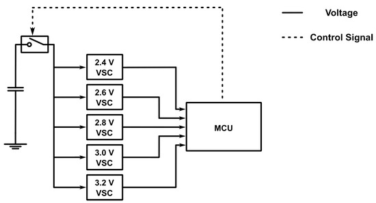 Simplified hardware design of the voltage supervisor subsystem. An analog switch is used to power an array of five voltage supervisor chips (VSCs) whenever a voltage reading is required. This subsystem enables the sensor node to measure the remaining energy stored in the energy storage element without incurring the overhead of using the analog to digital converter (ADC).