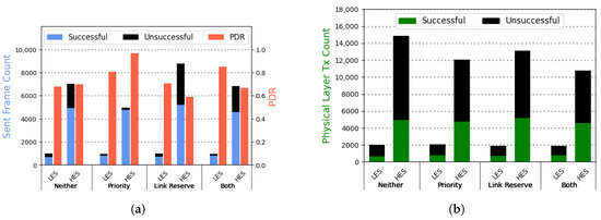 Regarding the link reservation mechanism, the results depicted in Figure 7 also show an improvement in the rate of successful frame transmission of the LES sender, compared to the baseline. This improvement is observed since issuing a link reserve request forces the HES to refrain from sending frames to the receiver temporarily, enabling the receiver to accumulate additional energy to accept more data before running out of power. This effect can be seen in the increased unsuccessful frames sent by the HES. In this case, the MAC layer immediately informs the higher layers about the reserved link and refuses to transmit it, resulting in an unsuccessful frame. Moreover, the refusal to send frames after a link reserve request is also evident from the reduced number of corresponding physical layer attempts compared to the baseline.