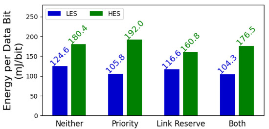 To assess how the prioritization and link reservation mechanisms affect energy utilization, we use our simulations to calculate the required energy to transmit one bit of data using the MAC protocol. Figure 8 depicts the energy consumed per data bit using each mechanism. As apparent from this figure, both of the aforementioned mechanisms reduce the required energy per bit for the LES. This reduction is particularly desirable for the LES since it has a tighter energy budget than the HES. This will, in turn, result in higher energy utilization, particularly for devices that do not have an abundant amount of energy.