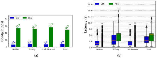 (a) Goodput achieved by the application under various MAC protocol mechanisms. For one LES and one HES, the prioritization and link reservation mechanisms generally result in higher goodput for the LES and lower goodput for the HES compared to the baseline case. (b) Latency under the various MAC protocol mechanisms. In general, enabling the prioritization mechanism leads to higher latencies because devices must attempt transmission on two different channels, thereby increasing the number of overall retransmission attempts required for successful frame delivery. The orange lines are a standard depiction for the median value.