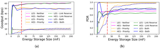 (a) Impact of the size of the energy storage on application goodput. In general, the goodput of the LES is best by using both prioritization and link reservation mechanisms, which is in direct contrast to the goodput of the HES. (b) The impact of the size of the energy storage element on the application packet delivery ratio. The HES has the highest PDR while using the prioritization mechanism since the receiver stays powered for a significant portion of the time using this mechanism. The HES can, therefore, eventually send its packet to the receiver successfully.