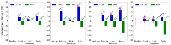 Finally, we evaluate the performance of the MAC protocol with more than two senders, increasing competition and evaluating the protocol’s ability to handle multiple energy-constrained senders. Figure 11 illustrates the relative change in mean goodput for different MAC protocol mechanisms across various numbers of LES devices (1, 3, 7, 16), compared to a baseline without any mechanism active. The red bars denote the range of goodput changes (min/max) among nodes, indicating whether mechanisms benefit all or only some LES devices. With one LES, as seen previously in Figure 9a, all mechanisms improve LES devices’ goodput, with both mechanisms together yielding a 19.9% increase but reducing the goodput of the HES by 18.0%. In this case, the link reservation mechanism, with an improvement of 7.1%, offers the least improvement to the LES. With three LES devices, enabling both mechanisms results in a 61.1% improvement for the LES devices and a 26.1% HES decline, the best improvement among 1–16 scenarios. For seven LES devices, the link reservation mechanism peaks at 25.6% w.r.t the improvement of the LES devices while reducing the goodput of the HES by 25.0%. When seventeen nodes (16 LES devices) try to communicate with one receiver, improvement is still 17.8% for the LES devices, with a 57.0% decrease in the goodput of the HES.
