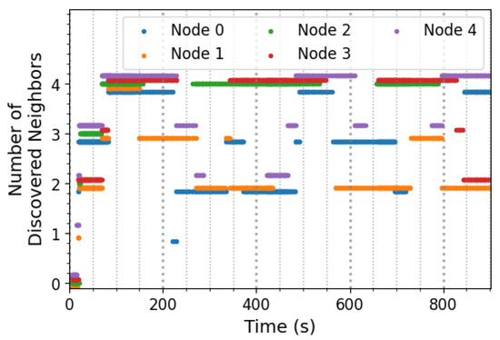 The first aspect we consider is the general behavior of the network of the batteryless devices while running the neighbor discovery protocol. In this case, we consider the operation of a network of devices with abundant harvestable energy so that the devices are, in effect, constantly powered without going through power cycles due to power loss. We carry out the experiment for 900 s to give the entire network enough time to stabilize. Each sensor node notifies a host machine during the experiment about the various protocol events using serial communication, and these events are later analyzed offline.