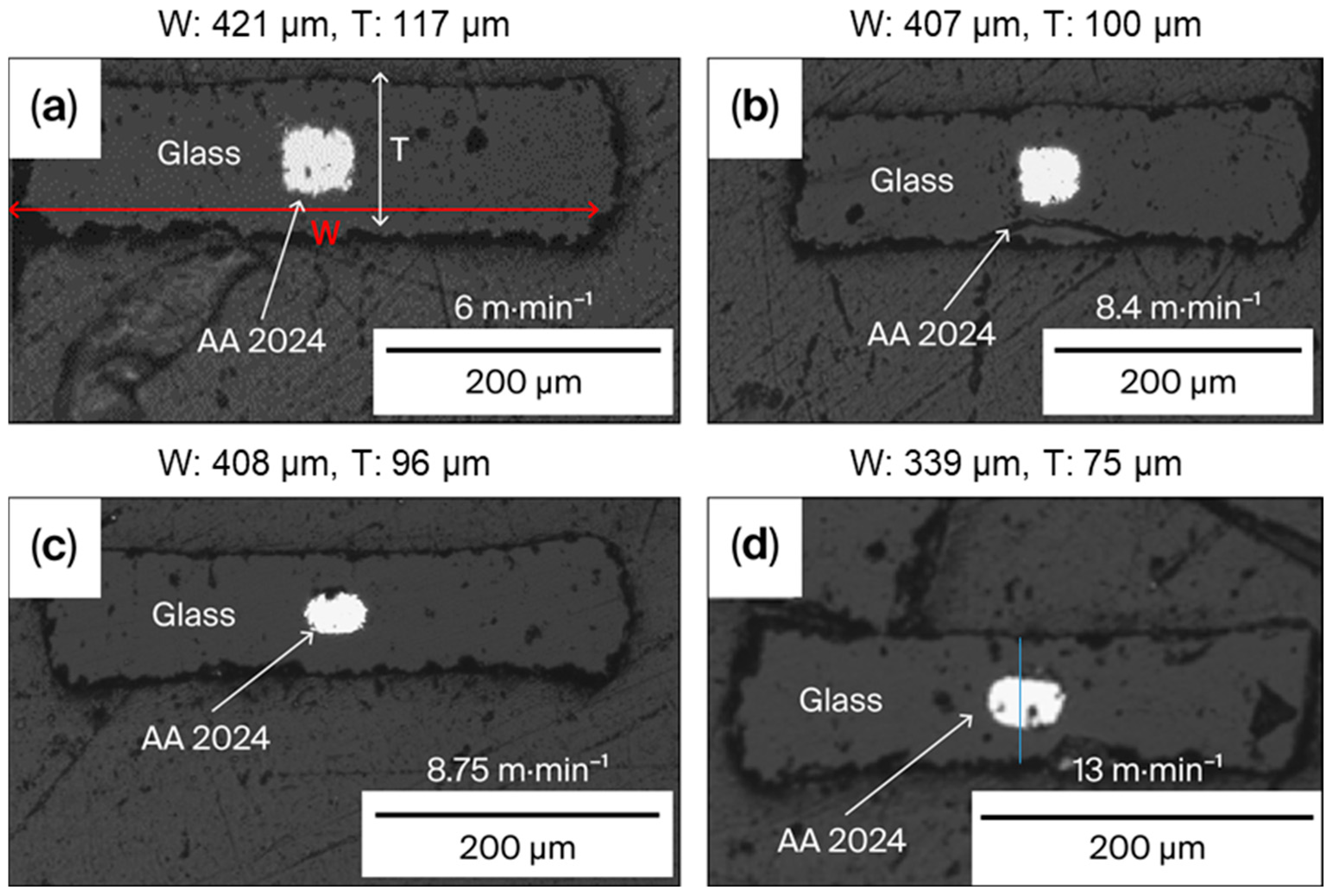 - Long multimaterial ribbons composed of soda–lime silicate glass and AA 2024 electrodes were successfully developed via the S&D technique for the first time.