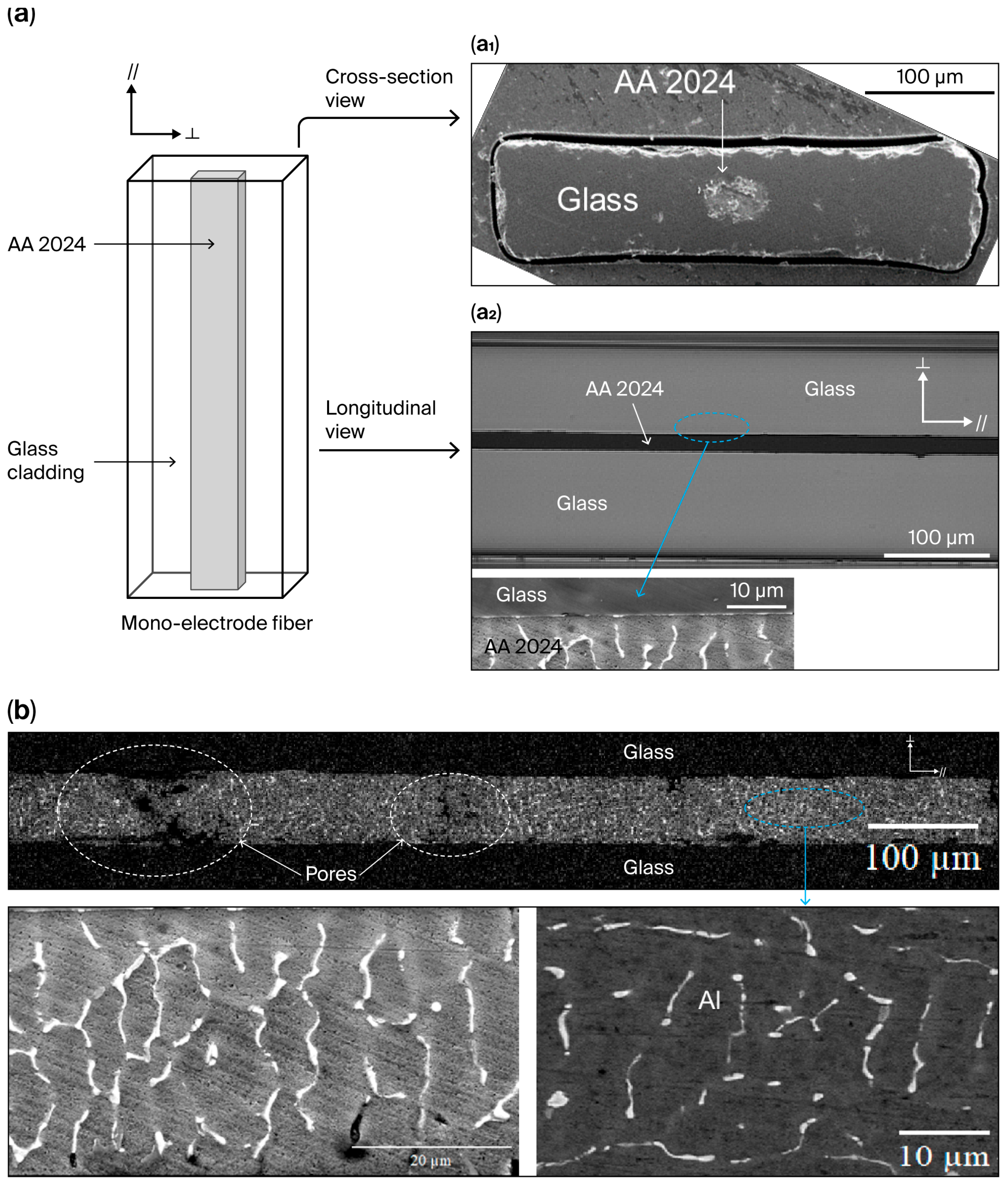 - The selection of an aluminum alloy such as AA 2024, instead of a pure metal, maintains the continuity of the electrodes during thermal drawing. The viscosity increases and the fluidity decreases due to the presence of alloying elements (Cu and Mg for the AA 2024) relative to pure aluminum, leading to a significant reduction in the electrode discontinuity. The right choice of Tdrawing is also essential to maintaining a high viscosity for the glass, thus preserving the preform shape (reducing dimensions) and containing the molten alloy.