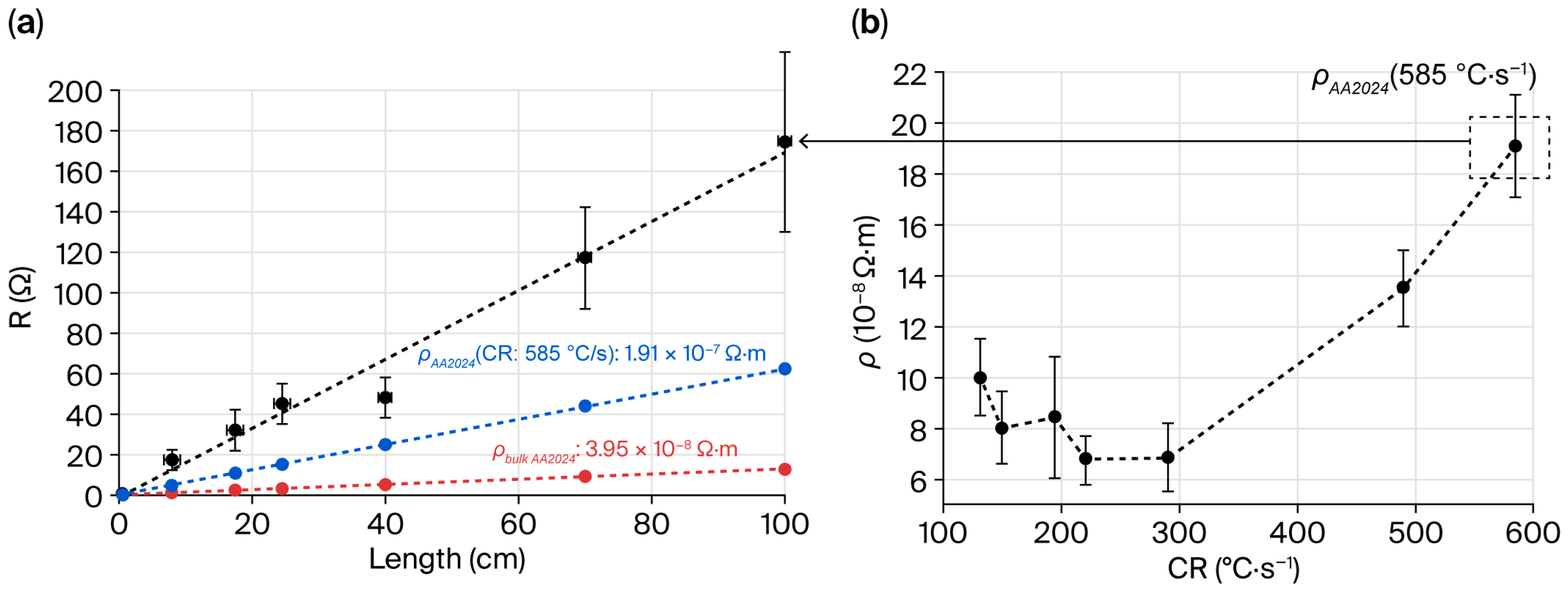 - An understanding of the microstructural changes and porosity formation is essential to controlling the electrical resistivity value. The cooling rate (i.e., vdrum and Tdrawing) is the key parameter. With the chosen bi-electrode geometry and materials, the CR remains between 200 and 300 °C/s.