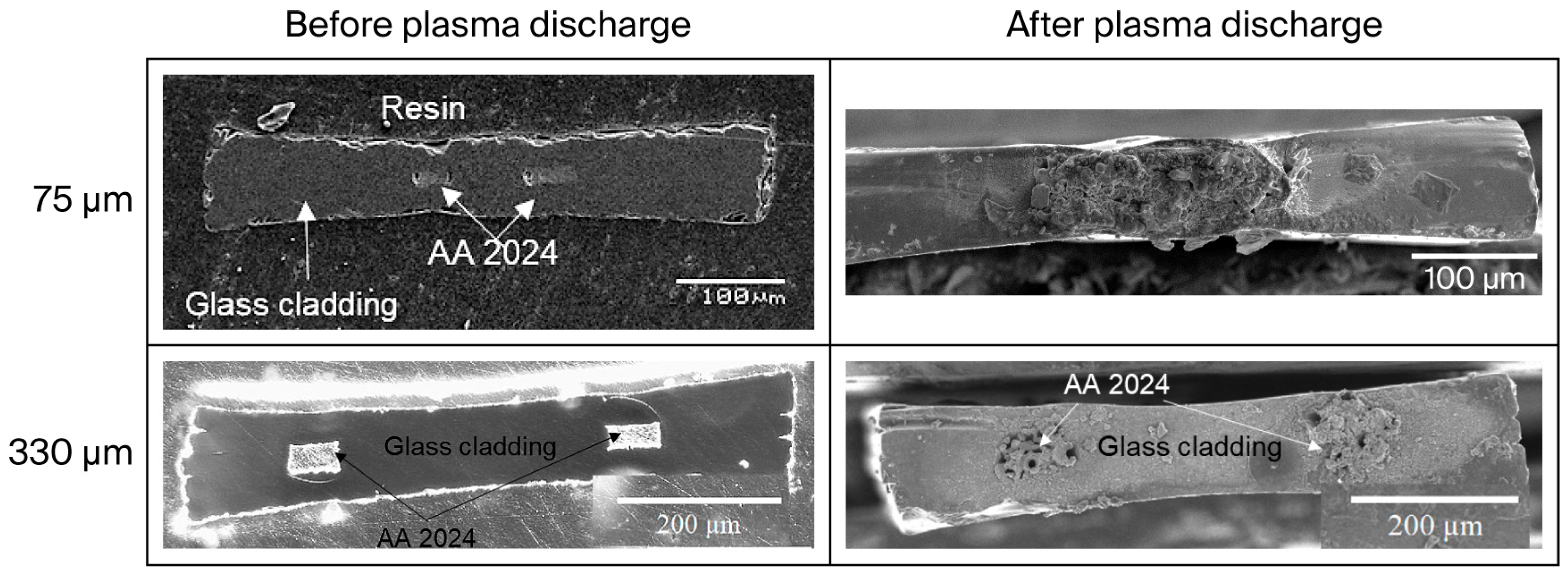 - Incorporation in the plasma of the glass cladding elements leading to the formation of the oxide layer. The triple junction effect enhances the interaction between the glass surrounding electrodes and the plasma because of the electric field amplification due to the free spaces between the glass and the electrodes [61]. This enhancement makes discharges more probable on the glass close to the electrodes and explains why most of the glass remains almost untouched by the discharge (see Figure 6, where the central part of the glass is not damaged).