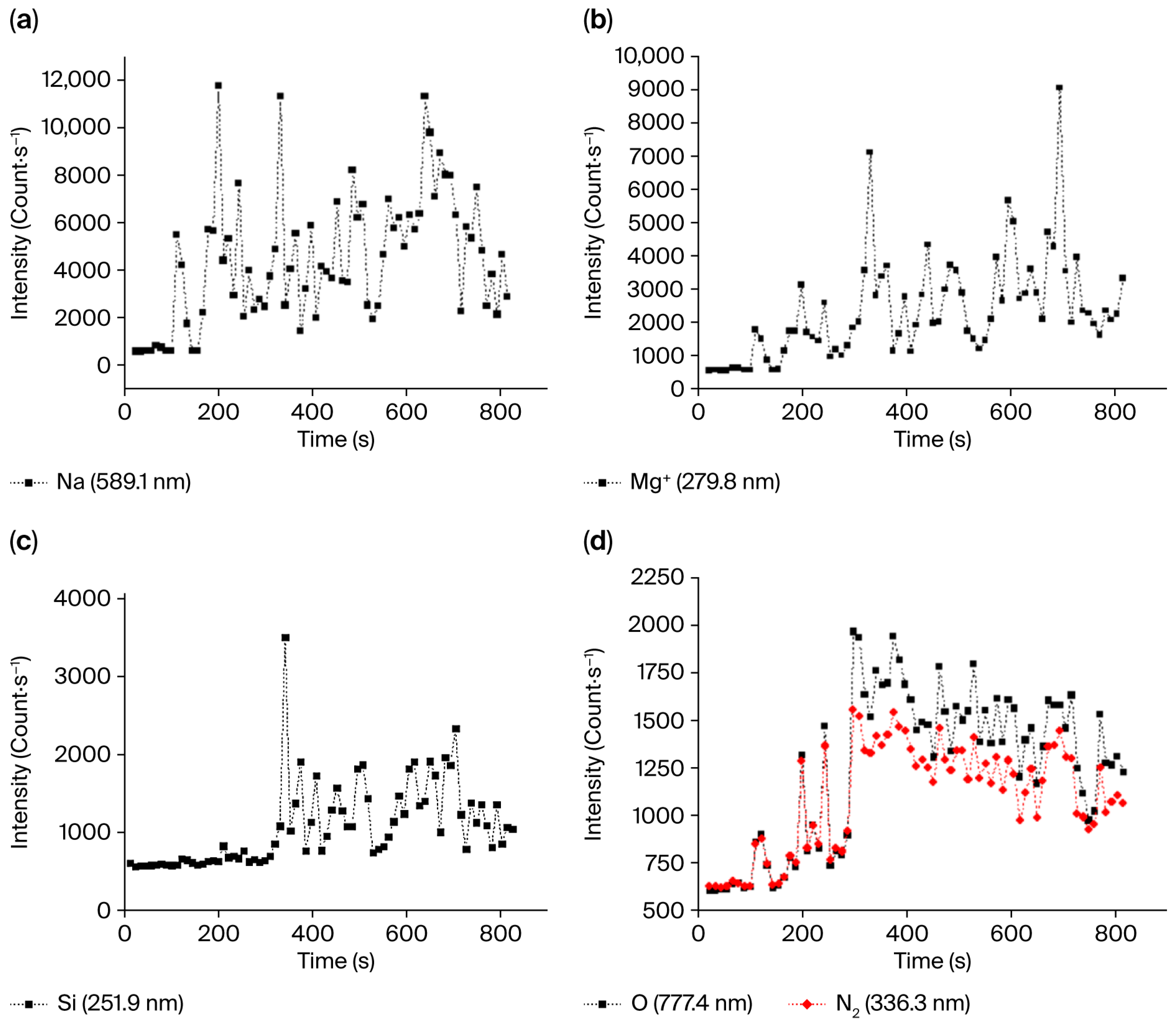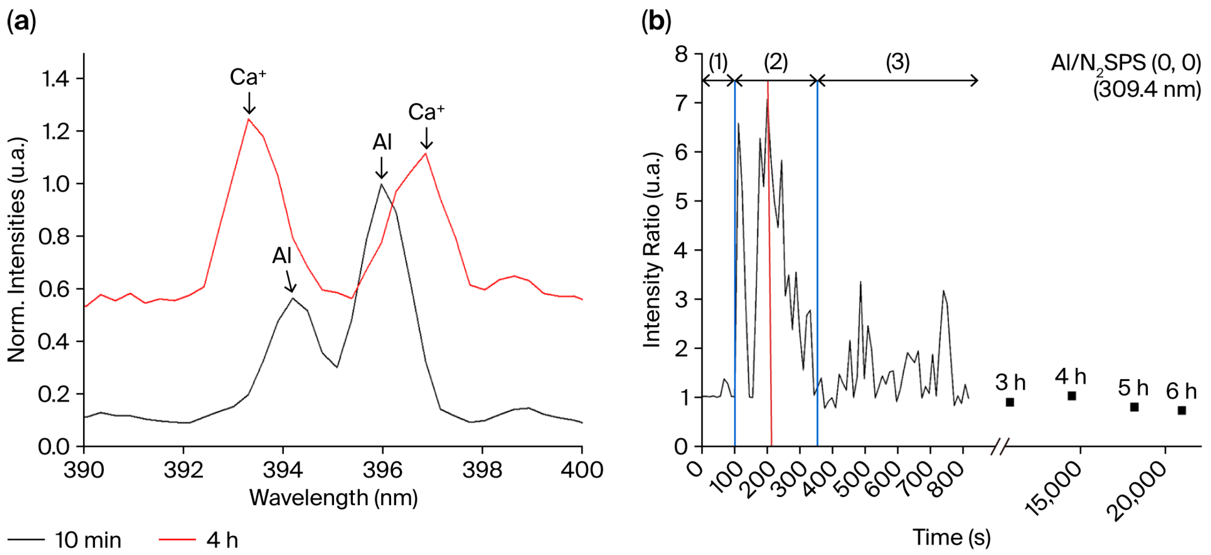 - Oxidation of the AA 2024 electrode surface due to the presence of oxygen in the plasma (Al emission line decrease, Figure 8b).