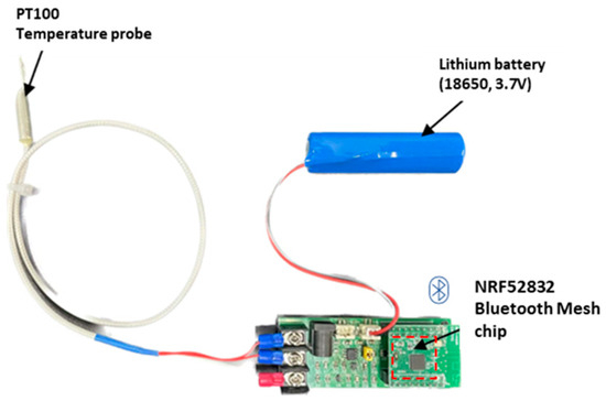A Bluetooth Mesh-based wireless-sensor network was developed for this work, consisting of multiple sensor nodes and a central client receiver. Each joint temperature sensor includes a PT100 platinum temperature probe (−50 °C to 250 °C, accuracy ±0.2 °C), an nRF52832 Bluetooth Mesh module, and a 3.7 V lithium battery for power supply. The nodes are installed at electrical–joint interfaces and secured with thermally conductive adhesive to ensure accurate heat coupling and reliable measurements.